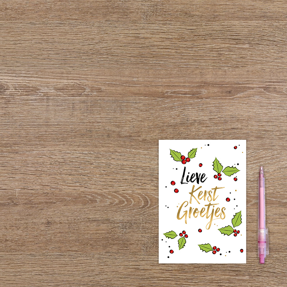 De wenskaart heeft een afmeting van x en een staande vorm. Op deze kerstkaart staan groene blaadjes met rode besjes en de tekst: "Lieve kerst groetjes". De binnenzijde van de wenskaart is blanco wat voldoende ruimte geeft om een persoonlijke boodschap te schrijven .