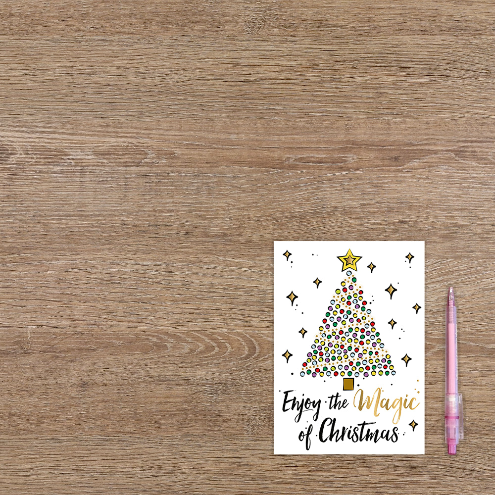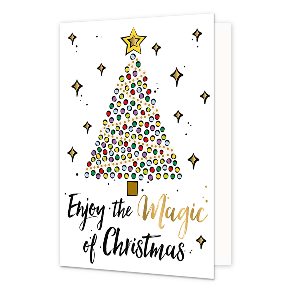 De wenskaart heeft een afmeting van x en een staande vorm. Op deze kerstkaart staat een kerstboom gemaakt van stippen in diverse kleuren en daaronder de tekst: "Enjoy the magic of christmas". De binnenzijde van de wenskaart is blanco wat voldoende ruimte geeft om een persoonlijke boodschap te schrijven .