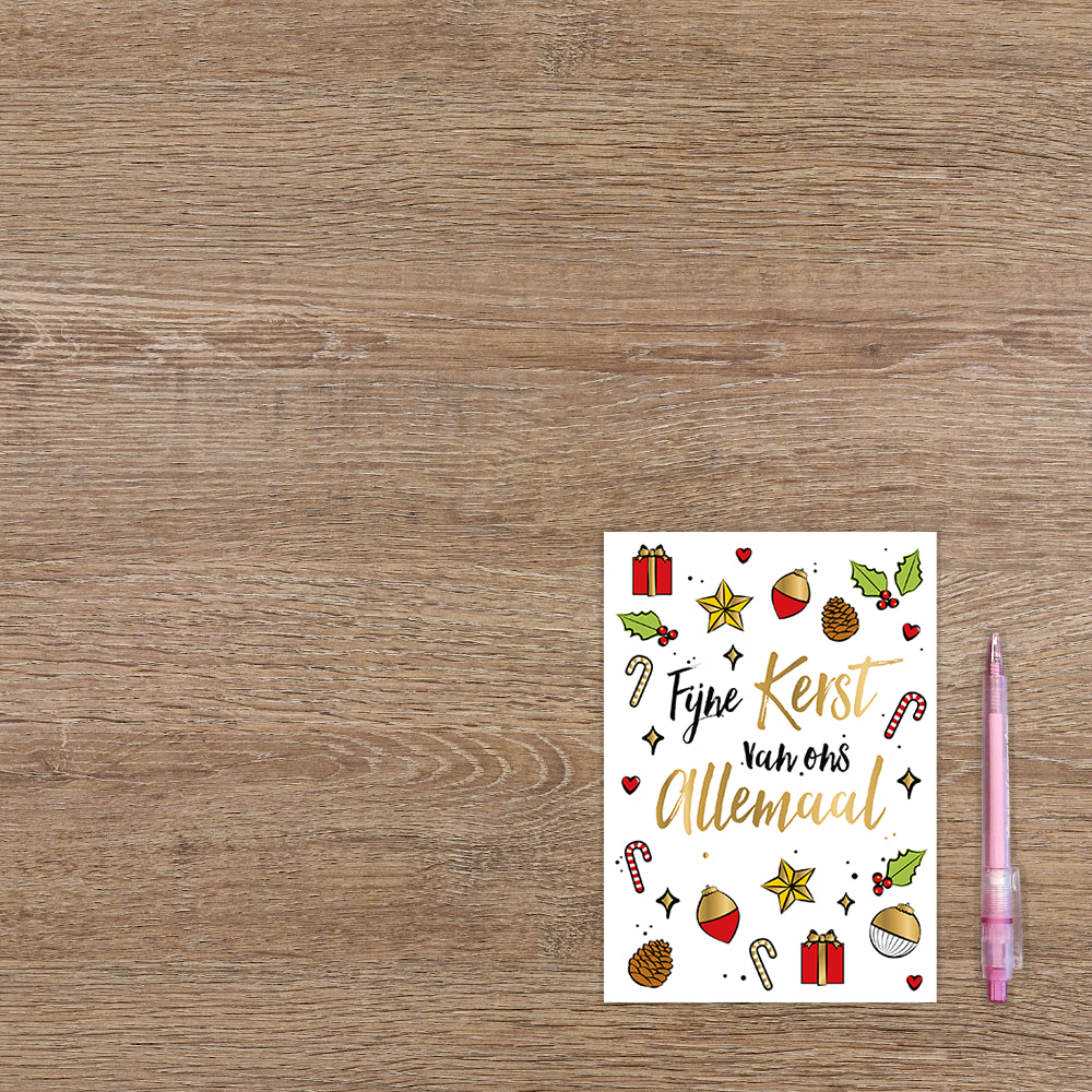 De wenskaart heeft een afmeting van x en een staande vorm. Op deze kerstkaart staan zuurstokken, dennenappels en kerstballen met in het midden de tekst: "Fijne kerst van ons allemaal". De binnenzijde van de wenskaart is blanco wat voldoende ruimte geeft om een persoonlijke boodschap te schrijven .