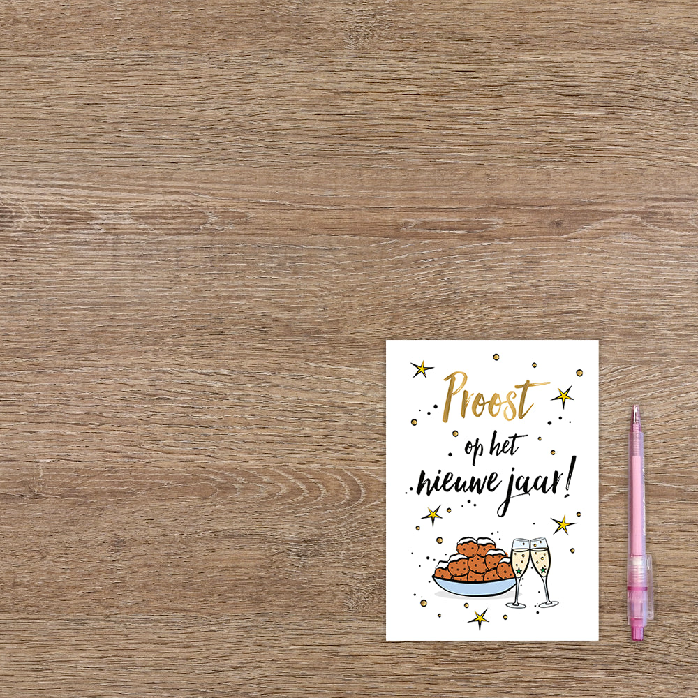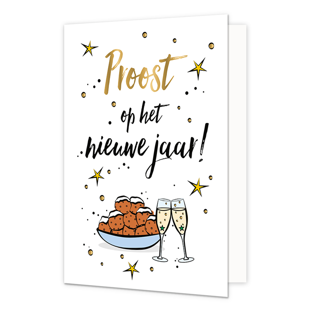 De wenskaart heeft een afmeting van x en een staande vorm. Op deze kerstkaart staan champagneglazen en oliebollen met de tekst: "Proost op het nieuwe jaar!". De binnenzijde van de wenskaart is blanco wat voldoende ruimte geeft om een persoonlijke boodschap te schrijven .