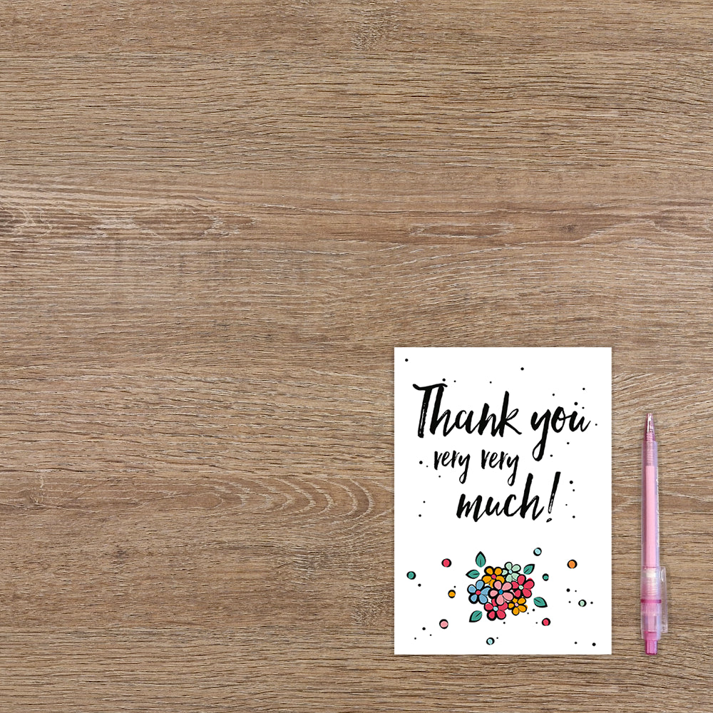 De wenskaart heeft een afmeting van x en een staande vorm. Op deze wenskaart staat de tekst: "Thank you very very much!" met bloemen eronder. De binnenzijde van de wenskaart is blanco wat voldoende ruimte geeft om een persoonlijke boodschap te schrijven .