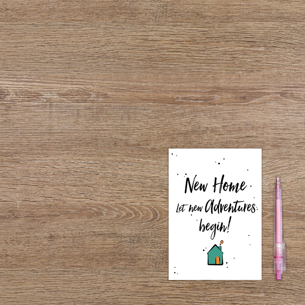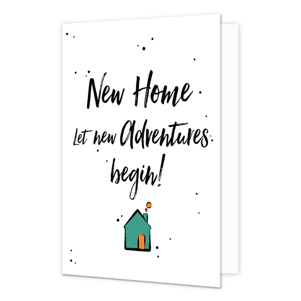 De wenskaart heeft een afmeting van x en een staande vorm. Op deze wenskaart staat de tekst: "New home let new adventures begin!" met een huisje eronder. De binnenzijde van de wenskaart is blanco wat voldoende ruimte geeft om een persoonlijke boodschap te schrijven .