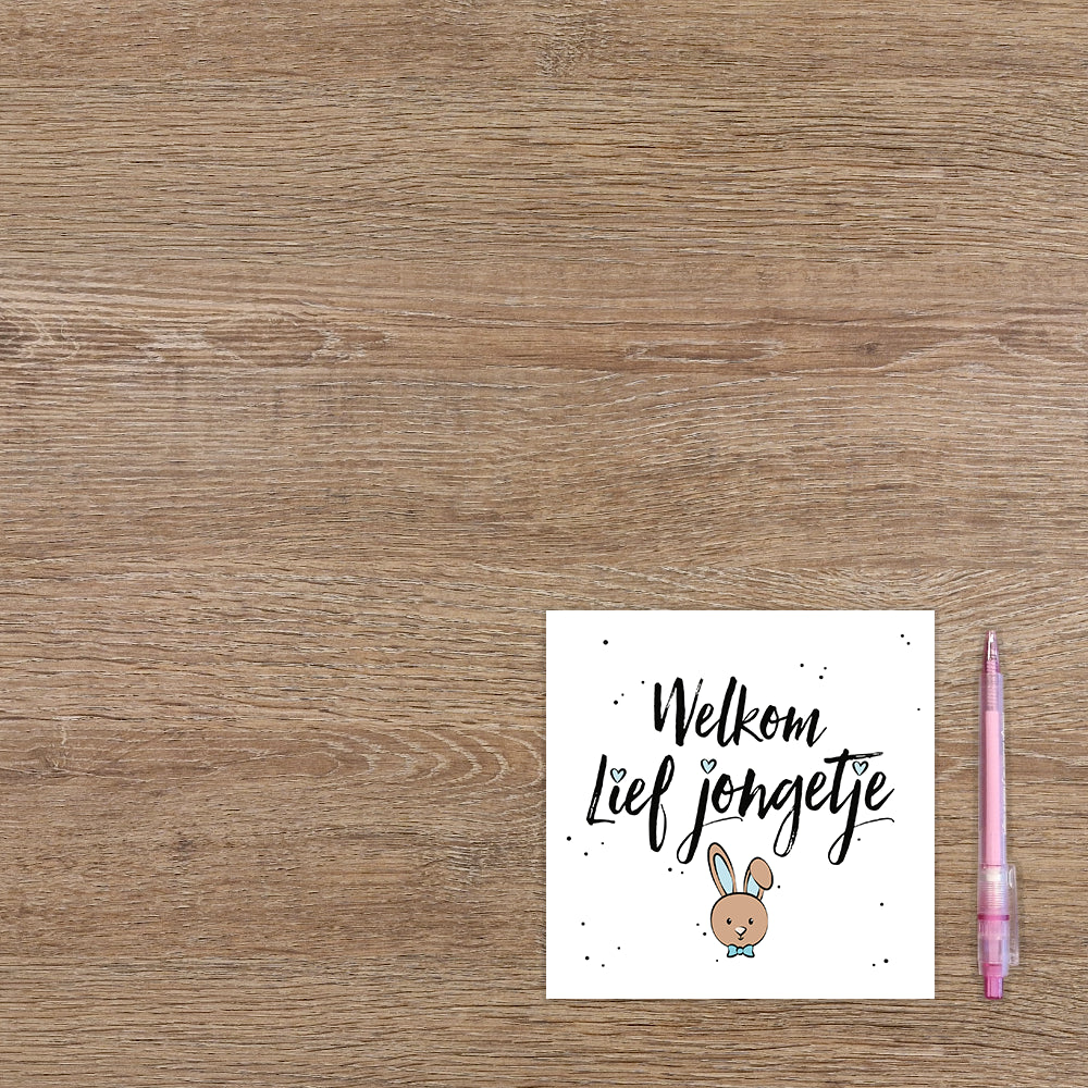 De wenskaart heeft een afmeting van x en een vierkante vorm. Op deze wenskaart staat de tekst: "Welkom lief jongetje" met blauwe hartjes op de i en onder de tekst een kleine tekening van een konijn. De binnenzijde van de wenskaart is blanco wat voldoende ruimte geeft om een persoonlijke boodschap te schrijven .