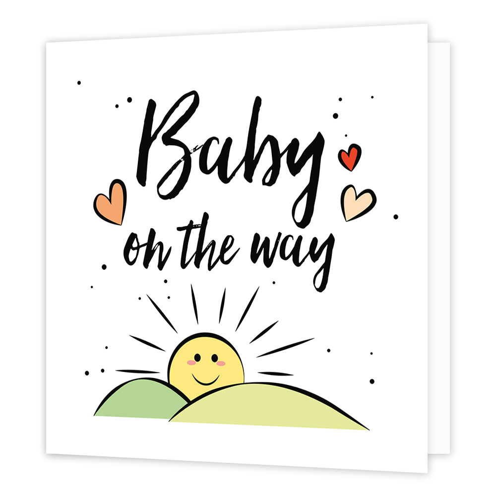 De wenskaart heeft een afmeting van x en een vierkante vorm. Op deze wenskaart staat de tekst: "Baby on the way" met hartjes ernaast en een tekening van een opkomende zon boven de bergen, onder de tekst. De binnenzijde van de wenskaart is blanco wat voldoende ruimte geeft om een persoonlijke boodschap te schrijven .