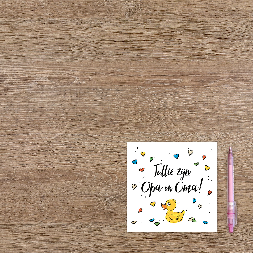 De wenskaart heeft een afmeting van x en een vierkante vorm. Op deze wenskaart staat de tekst: "Jullie zijn opa en oma!" omringt door hartjes in diverse kleuren en een geel badeendje onder de tekst. De binnenzijde van de wenskaart is blanco wat voldoende ruimte geeft om een persoonlijke boodschap te schrijven .