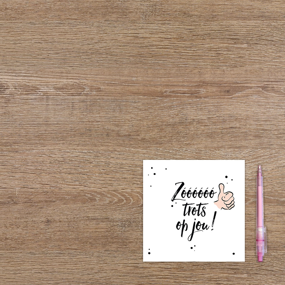 De wenskaart heeft een afmeting van x en een vierkante vorm. Op deze wenskaart staat de tekst: "Zóóóóóó trots op jou!" met een duim ernaast. De binnenzijde van de wenskaart is blanco wat voldoende ruimte geeft om een persoonlijke boodschap te schrijven .