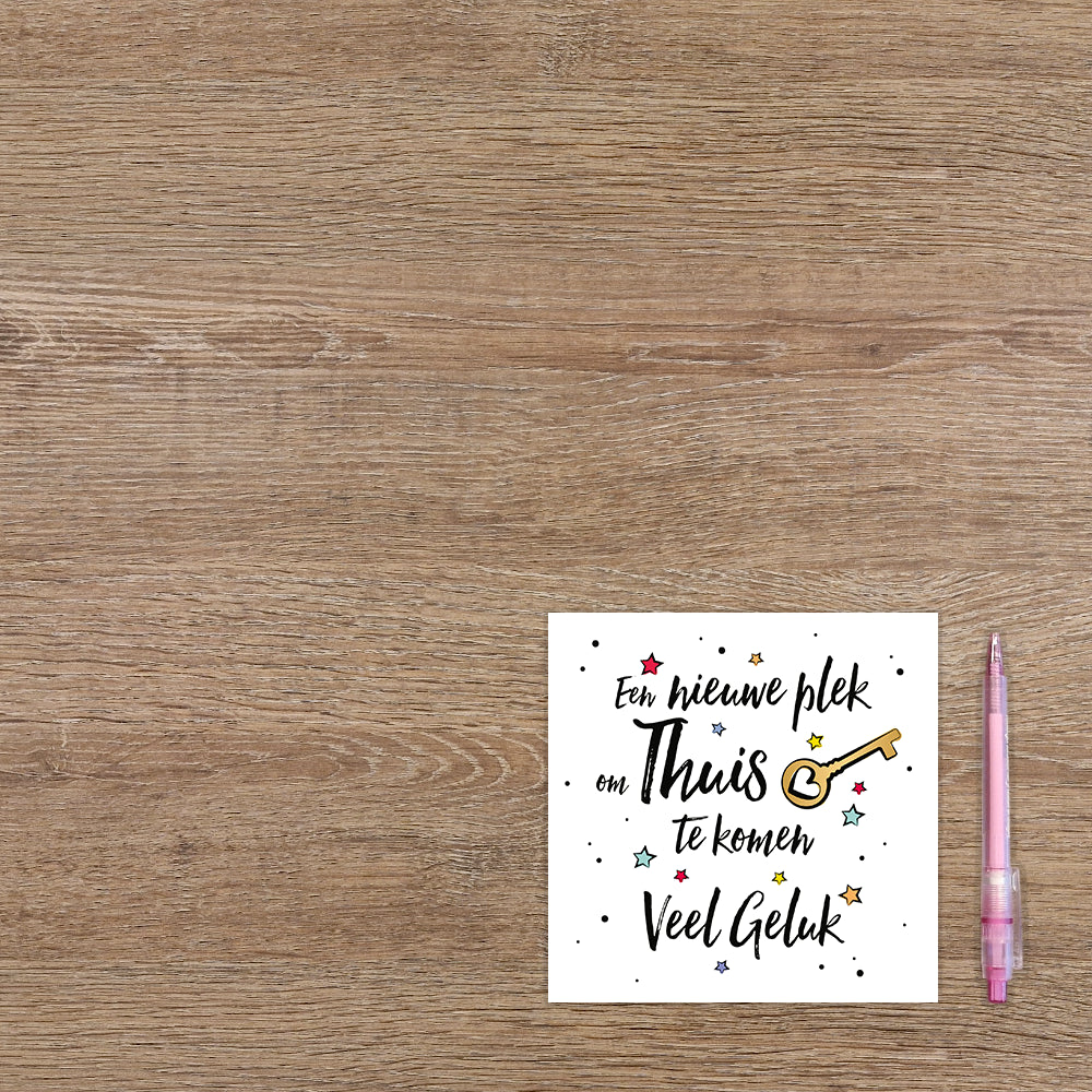 De wenskaart heeft een afmeting van x en een vierkante vorm. Op deze wenskaart staat de tekst: "Een nieuwe plek om thuis te komen veel geluk" omringt door sterren en een sleutel. De binnenzijde van de wenskaart is blanco wat voldoende ruimte geeft om een persoonlijke boodschap te schrijven .