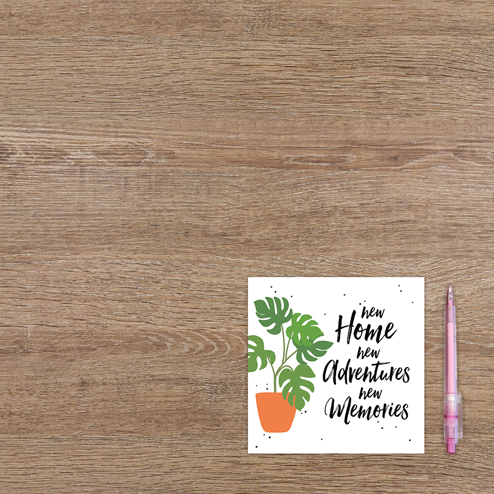 De wenskaart heeft een afmeting van 14 cm x 14 cm en een vierkante vorm. Op deze wenskaart staat links een monstera plant in een oranje pot. Op de kaart staan meerdere kleine zwarte stippen. Rechts in het midden van de kaart staat in het zwart de tekst 'new home new adventures new memories'. De binnenzijde van de wenskaart is blanco wat voldoende ruimte geeft om een persoonlijke boodschap te schrijven.