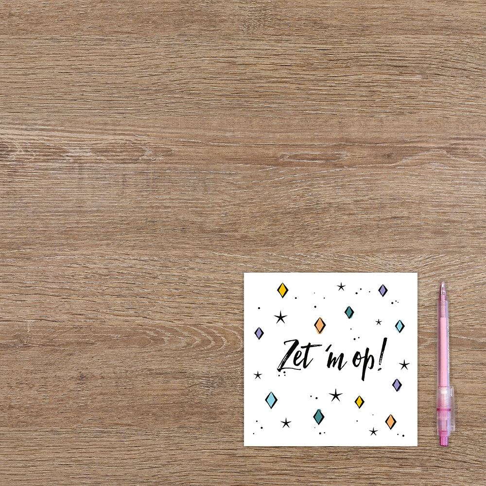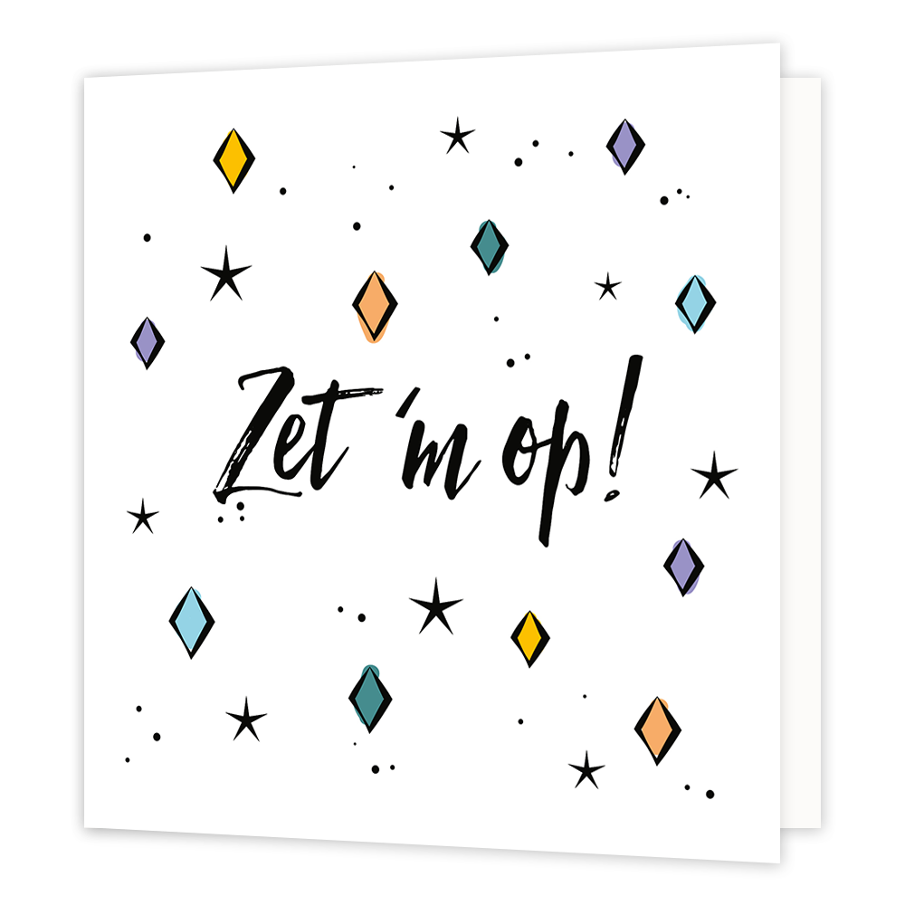 De wenskaart heeft een afmeting van x en een vierkante vorm. Op deze wenskaart staat de tekst: "Zet 'm op!" omringt door ruitjes in diverse kleuren. De binnenzijde van de wenskaart is blanco wat voldoende ruimte geeft om een persoonlijke boodschap te schrijven .