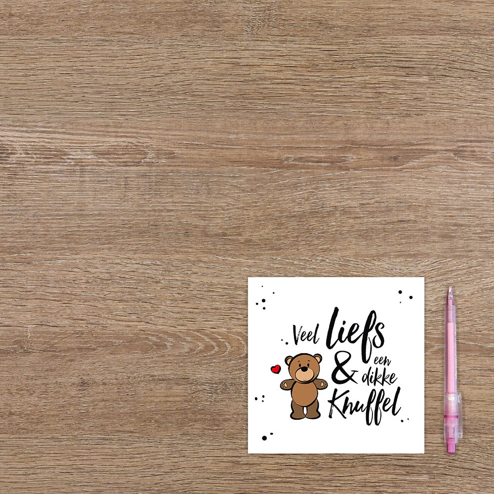 De wenskaart heeft een afmeting van x en een vierkante vorm. Op deze wenskaart staat de tekst: "Veel liefs & een dikke knuffel" met een teddybeer naast de tekst. De binnenzijde van de wenskaart is blanco wat voldoende ruimte geeft om een persoonlijke boodschap te schrijven .
