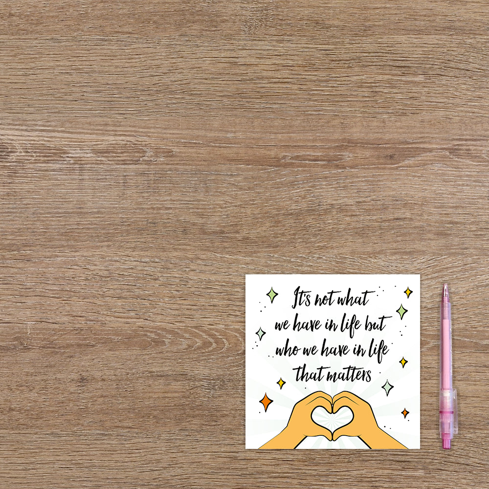 De wenskaart heeft een afmeting van x en een vierkante vorm. Op deze wenskaart staan handen die een hartje vormen met sterren en de tekst: "It's not what we have in life but who we have in life that matters". De binnenzijde van de wenskaart is blanco wat voldoende ruimte geeft om een persoonlijke boodschap te schrijven .