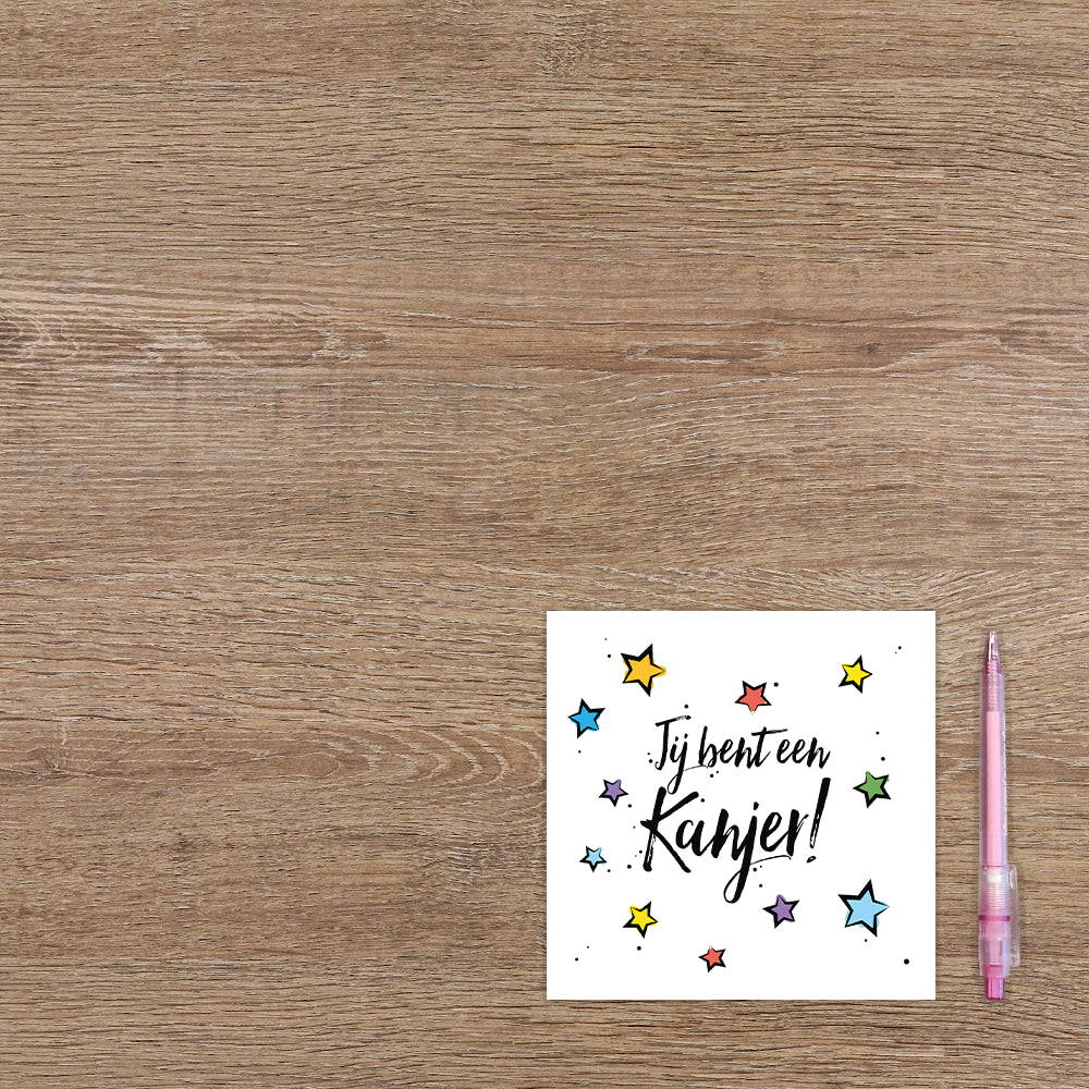 De wenskaart heeft een afmeting van x en een vierkante vorm. Op deze wenskaart staat de tekst: "Jij bent een kanjer!" omringt door sterren. De binnenzijde van de wenskaart is blanco wat voldoende ruimte geeft om een persoonlijke boodschap te schrijven .