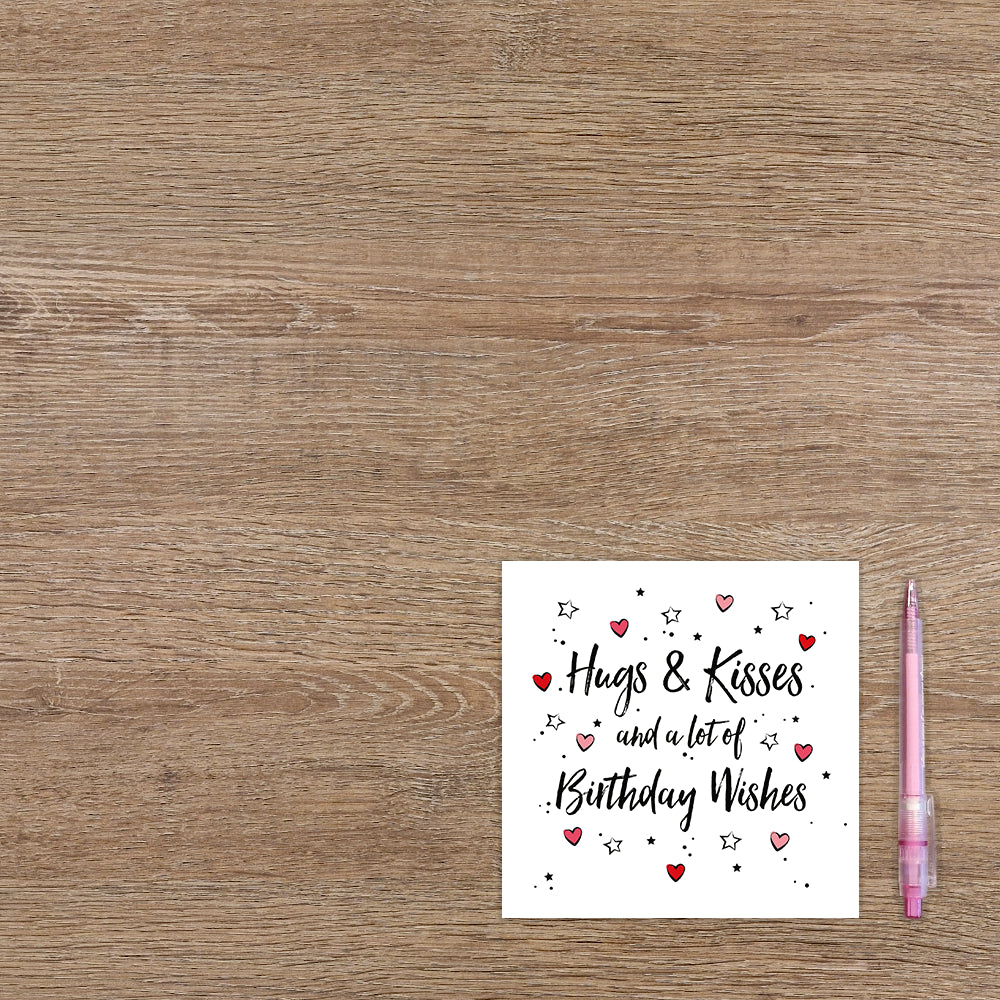 De wenskaart heeft een afmeting van x en een vierkante vorm. Op deze wenskaart staat de tekst: "Hugs & kisses and a lot of birthday wishes" omringt door hartjes en sterren. De binnenzijde van de wenskaart is blanco wat voldoende ruimte geeft om een persoonlijke boodschap te schrijven .