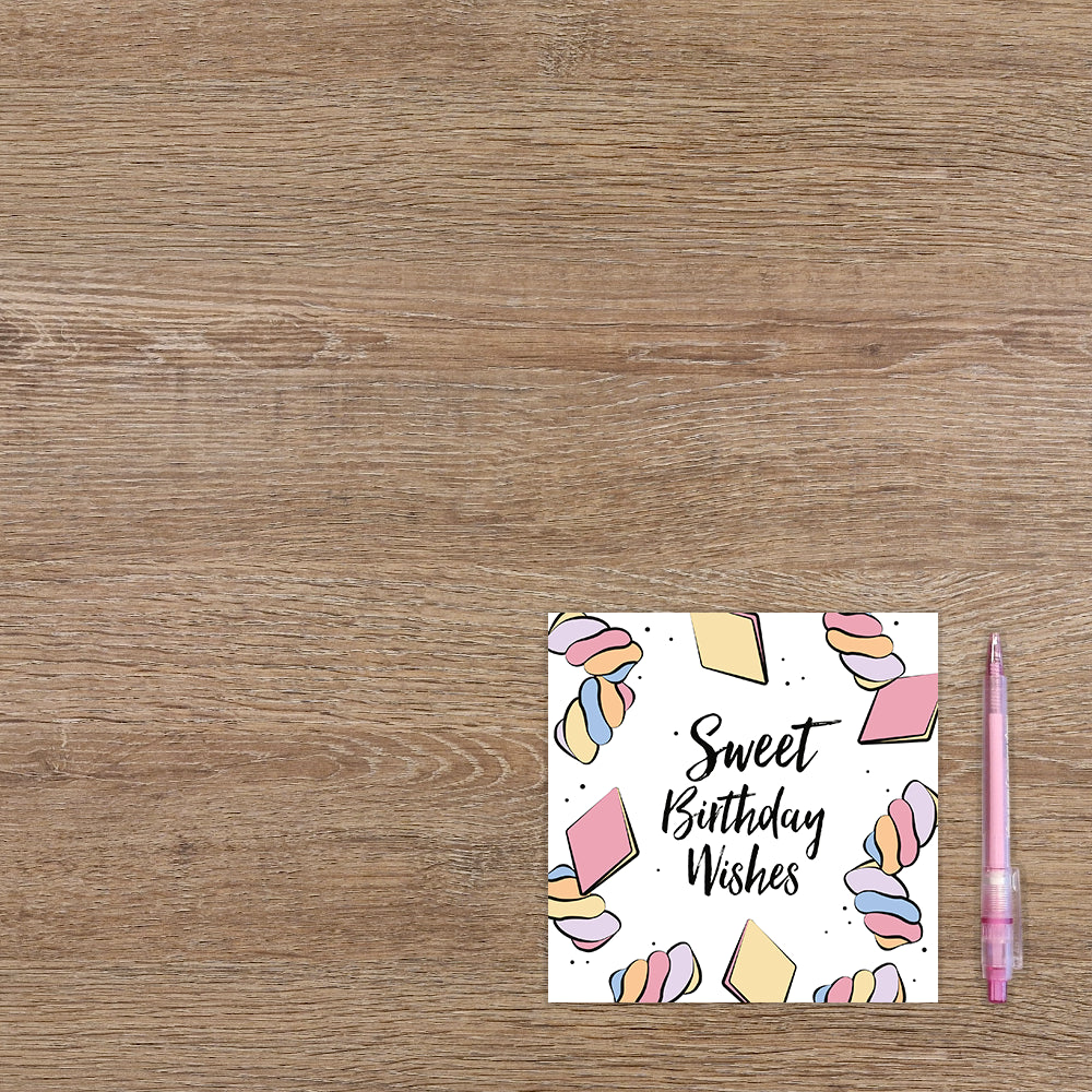 De wenskaart heeft een afmeting van x en een vierkante vorm. Op deze wenskaart staan spekjes met in het midden de tekst: "Sweet birthday wishes". De binnenzijde van de wenskaart is blanco wat voldoende ruimte geeft om een persoonlijke boodschap te schrijven .