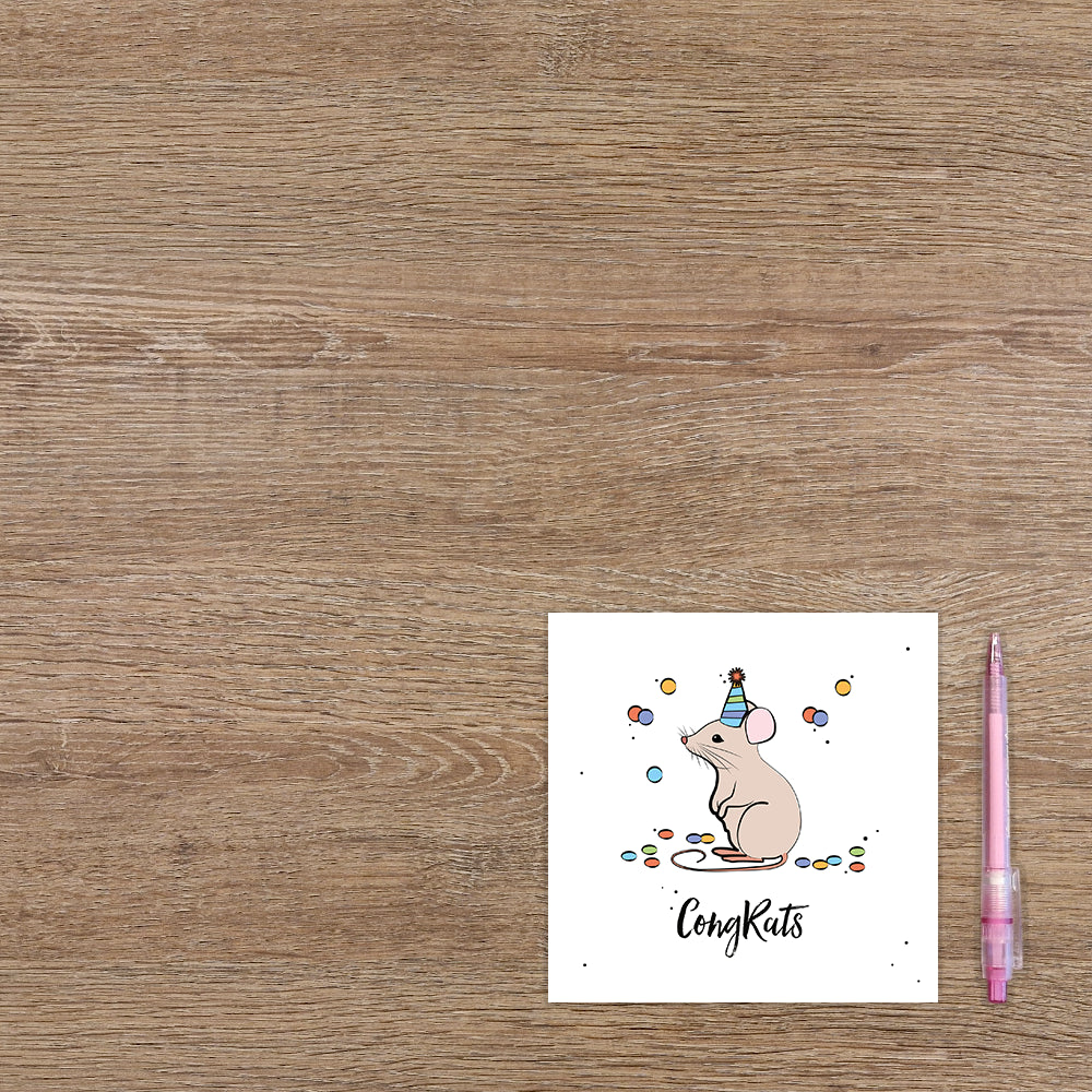De wenskaart heeft een afmeting van x en een vierkante vorm. Op deze wenskaart staat een muisje omringt door confetti met daaronder de tekst: "Congrats". De binnenzijde van de wenskaart is blanco wat voldoende ruimte geeft om een persoonlijke boodschap te schrijven .