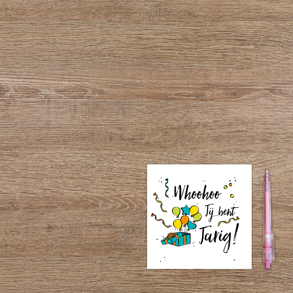 De wenskaart heeft een afmeting van x en een vierkante vorm. Op deze wenskaart staat de tekst: "Whoohoo jij bent jarig" met een cadeau waar ballonnen en slingers uit komen. De binnenzijde van de wenskaart is blanco wat voldoende ruimte geeft om een persoonlijke boodschap te schrijven .