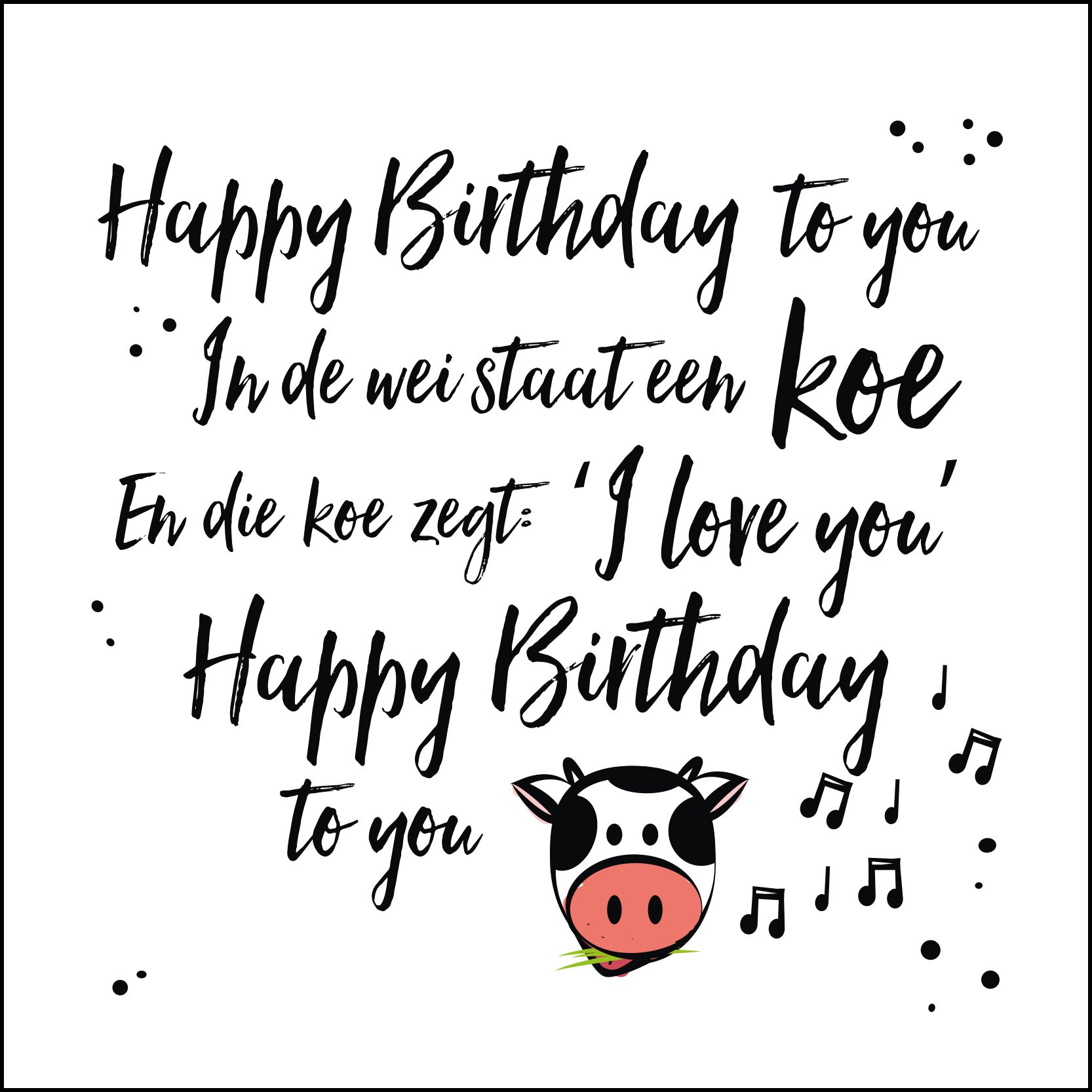 De wenskaart heeft een afmeting van x en een vierkante vorm. Op deze wenskaart staat de tekst: "Happy birthday to you. In de wei staat een koe en die koe zegt: I love you. Happy birthday to you". De binnenzijde van de wenskaart is blanco wat voldoende ruimte geeft om een persoonlijke boodschap te schrijven .