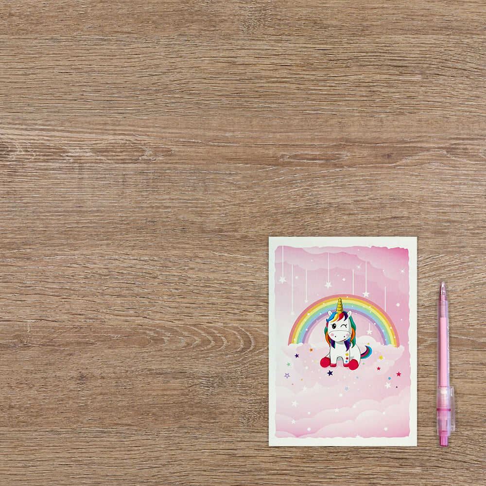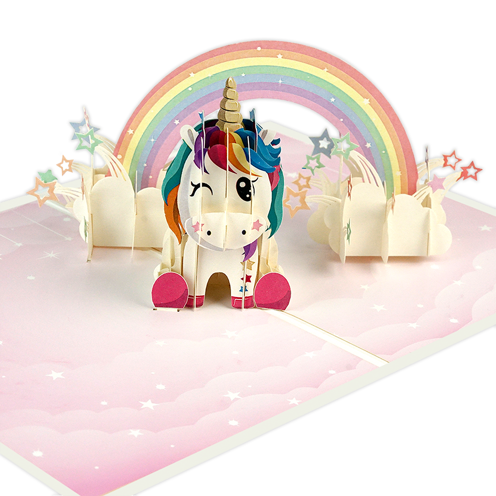 De wenskaart heeft een afmeting van x en een staande vorm. Op deze wenskaart staat een regenboog met daaronder een eenhoorn die op een roze wolk zit. De binnenzijde van de wenskaart is bedrukt met een 3D pop-up ontwerp wat de kaart tot leven brengt .