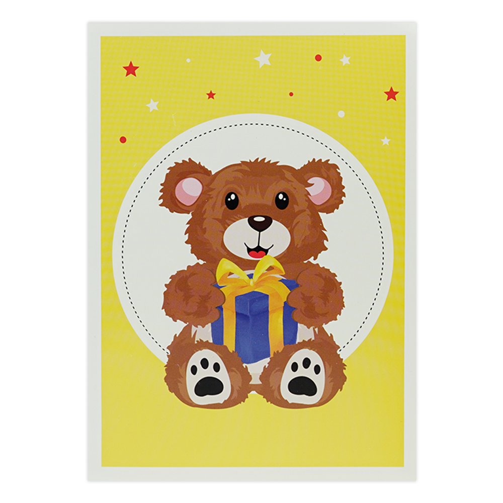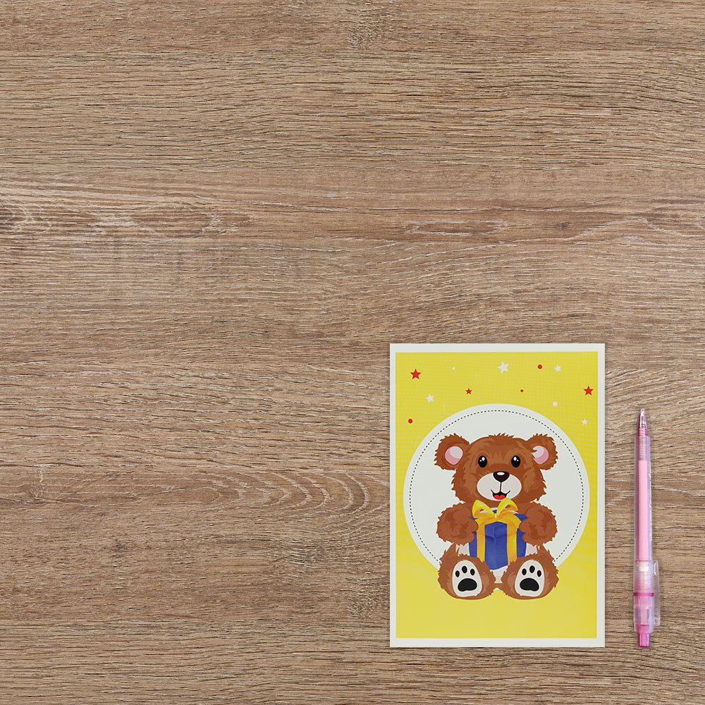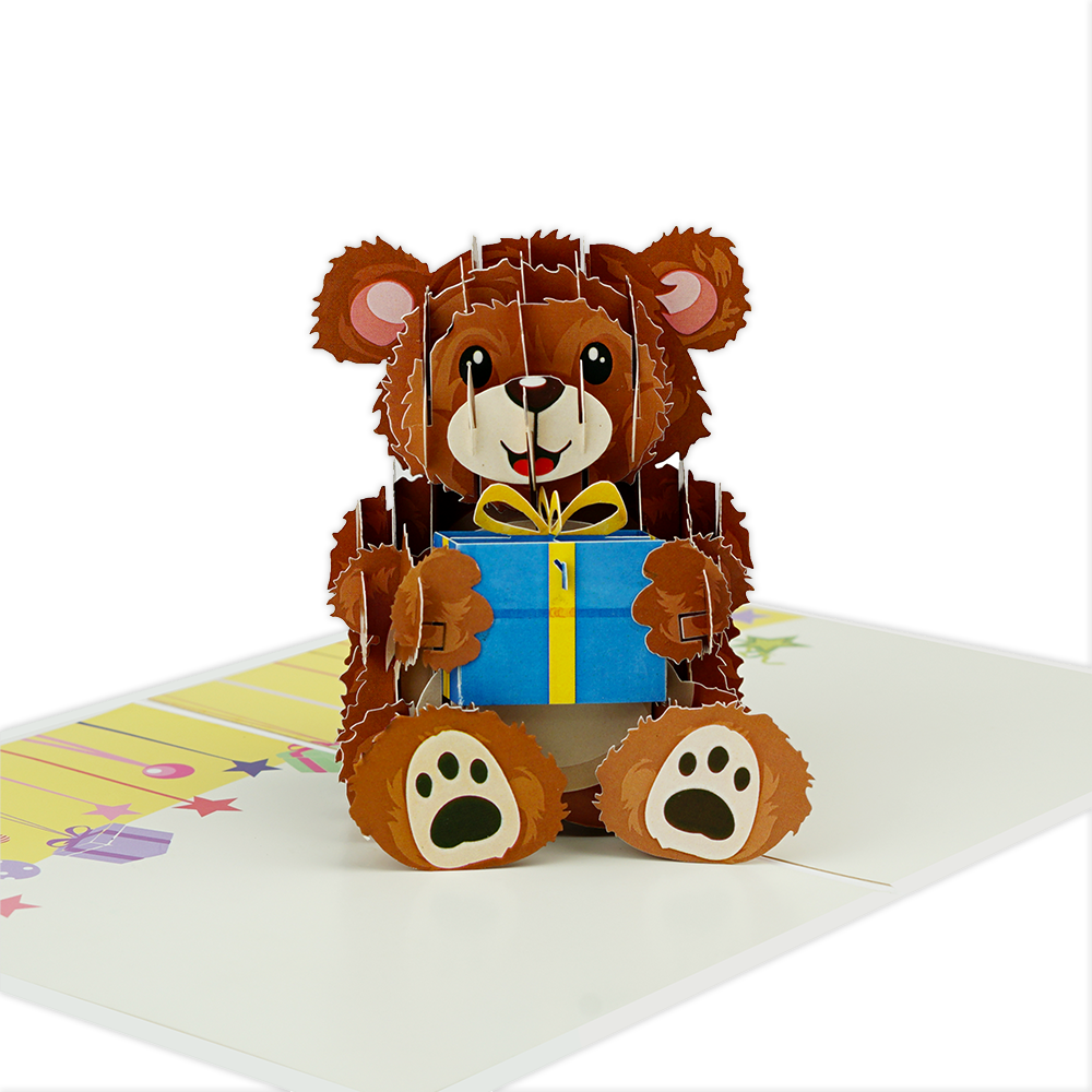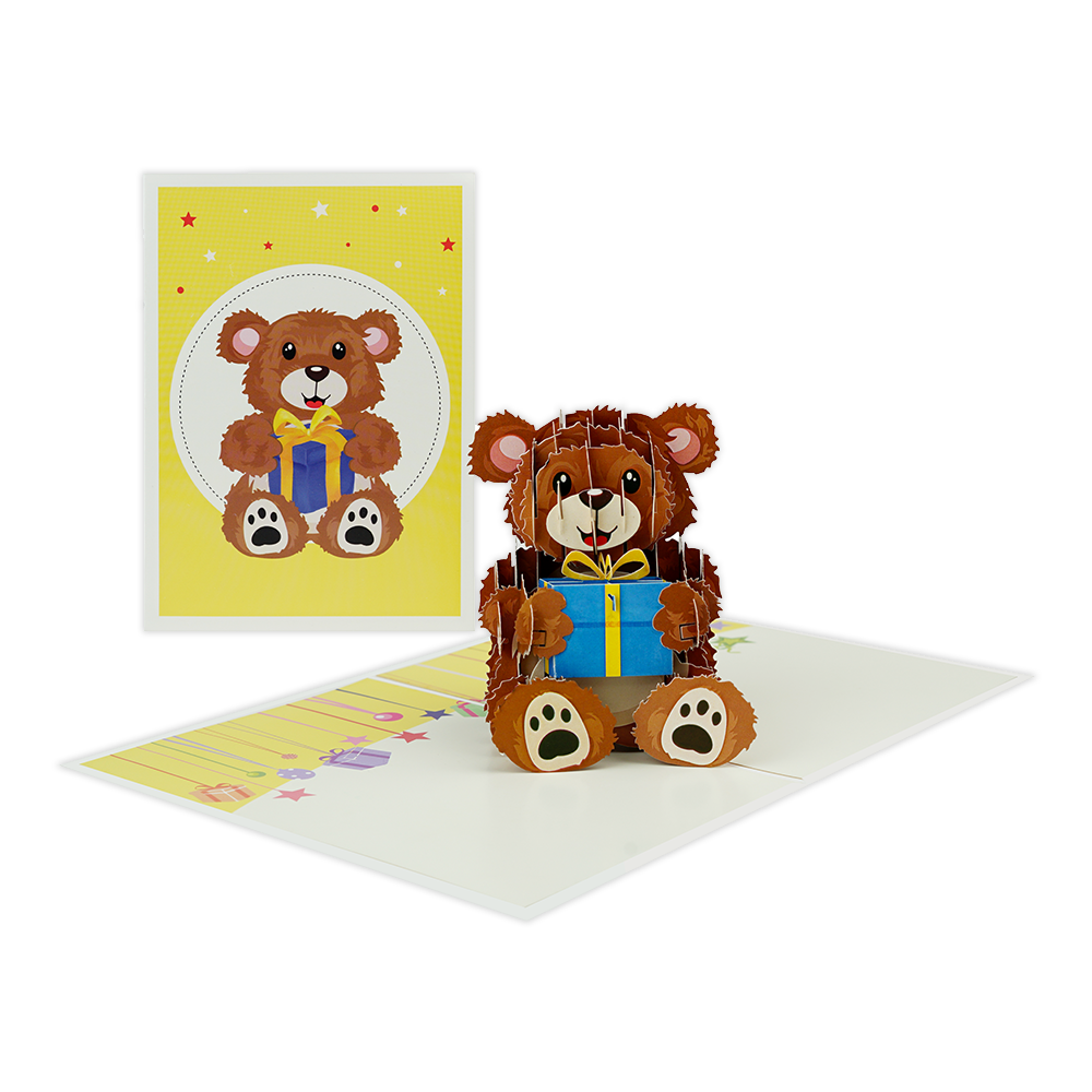 De wenskaart heeft een afmeting van x en een staande vorm. Op deze wenskaart staat een beer die een cadeau vast houdt. De binnenzijde van de wenskaart is bedrukt met een 3D pop-up ontwerp wat de kaart tot leven brengt .