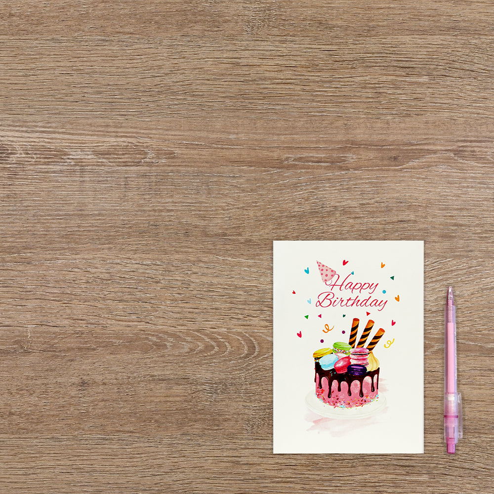 De wenskaart heeft een afmeting van x en een staande vorm. Op deze wenskaart staat een grote taart met daarboven de tekst: "Happy birthday". De binnenzijde van de wenskaart is bedrukt met een 3D pop-up ontwerp wat de kaart tot leven brengt .