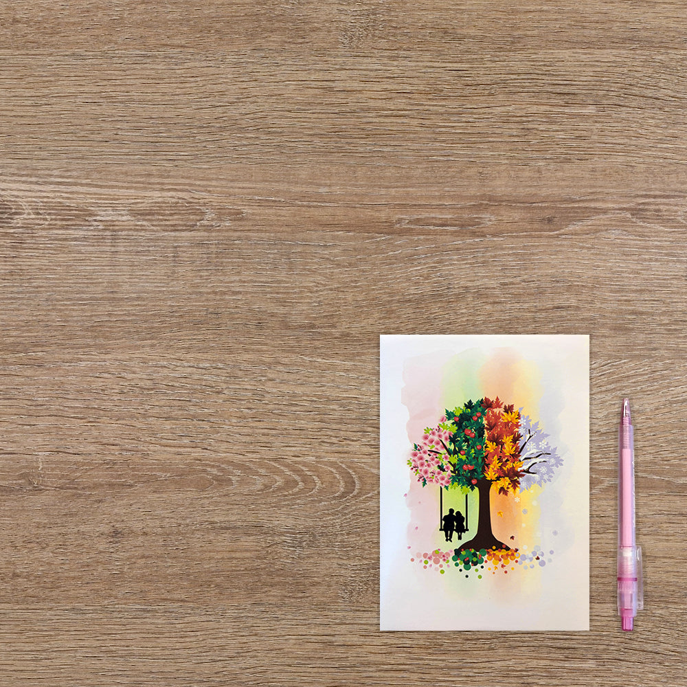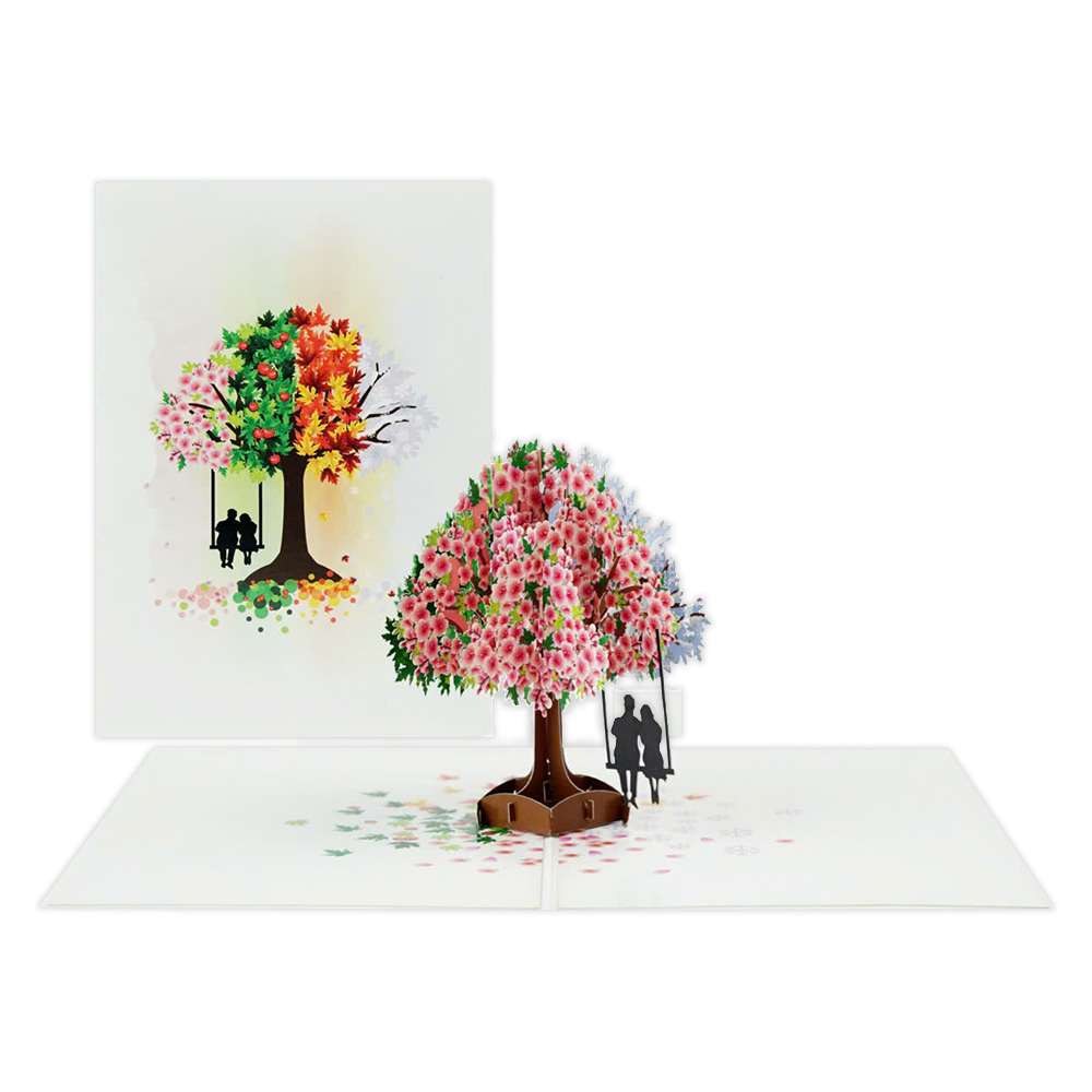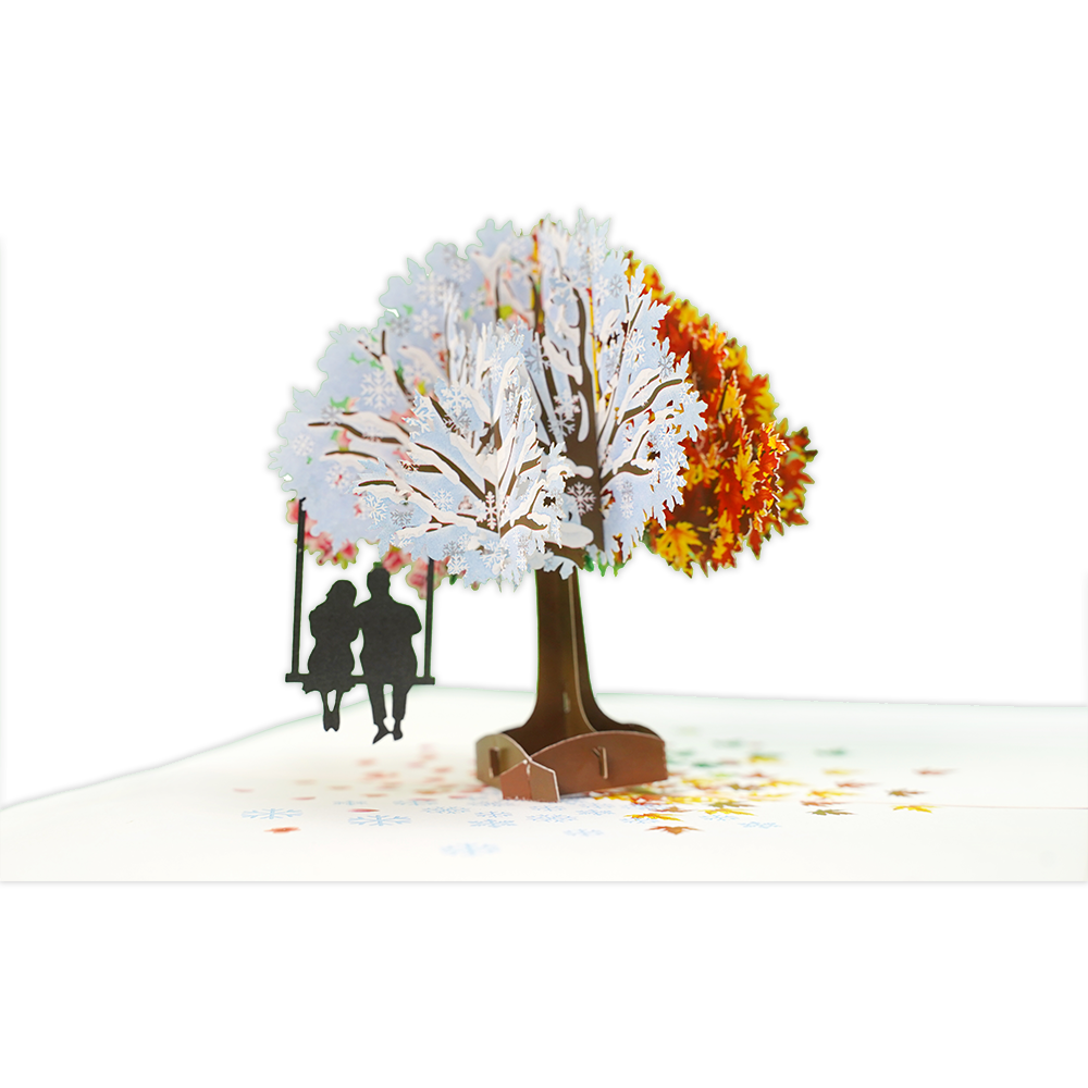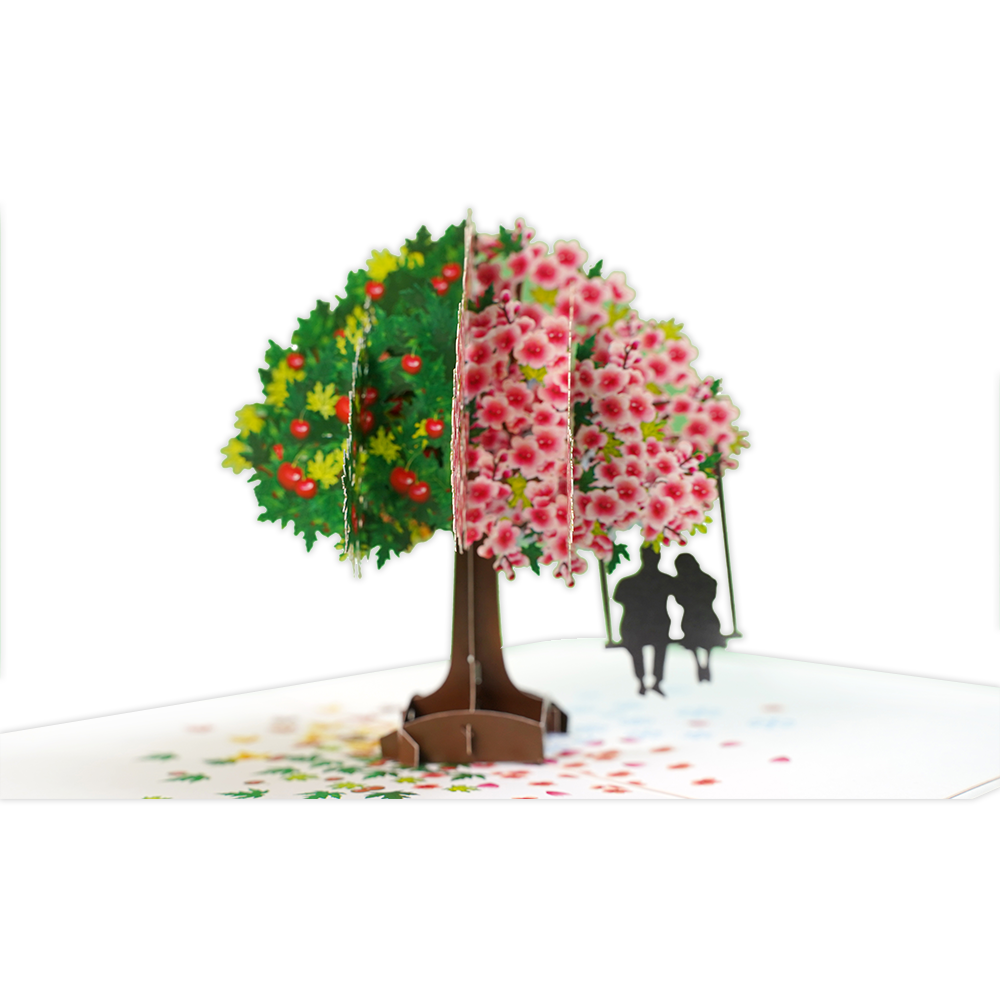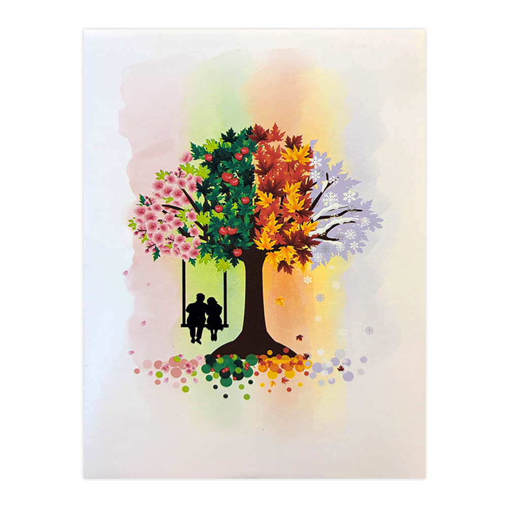 De wenskaart heeft een afmeting van x en een staande vorm. Op deze wenskaart staat een grote boom met een tak waar een schommel aan hangt. Op de schommel zitten een man en een vrouw. De binnenzijde van de wenskaart is bedrukt met een 3D pop-up ontwerp wat de kaart tot leven brengt .