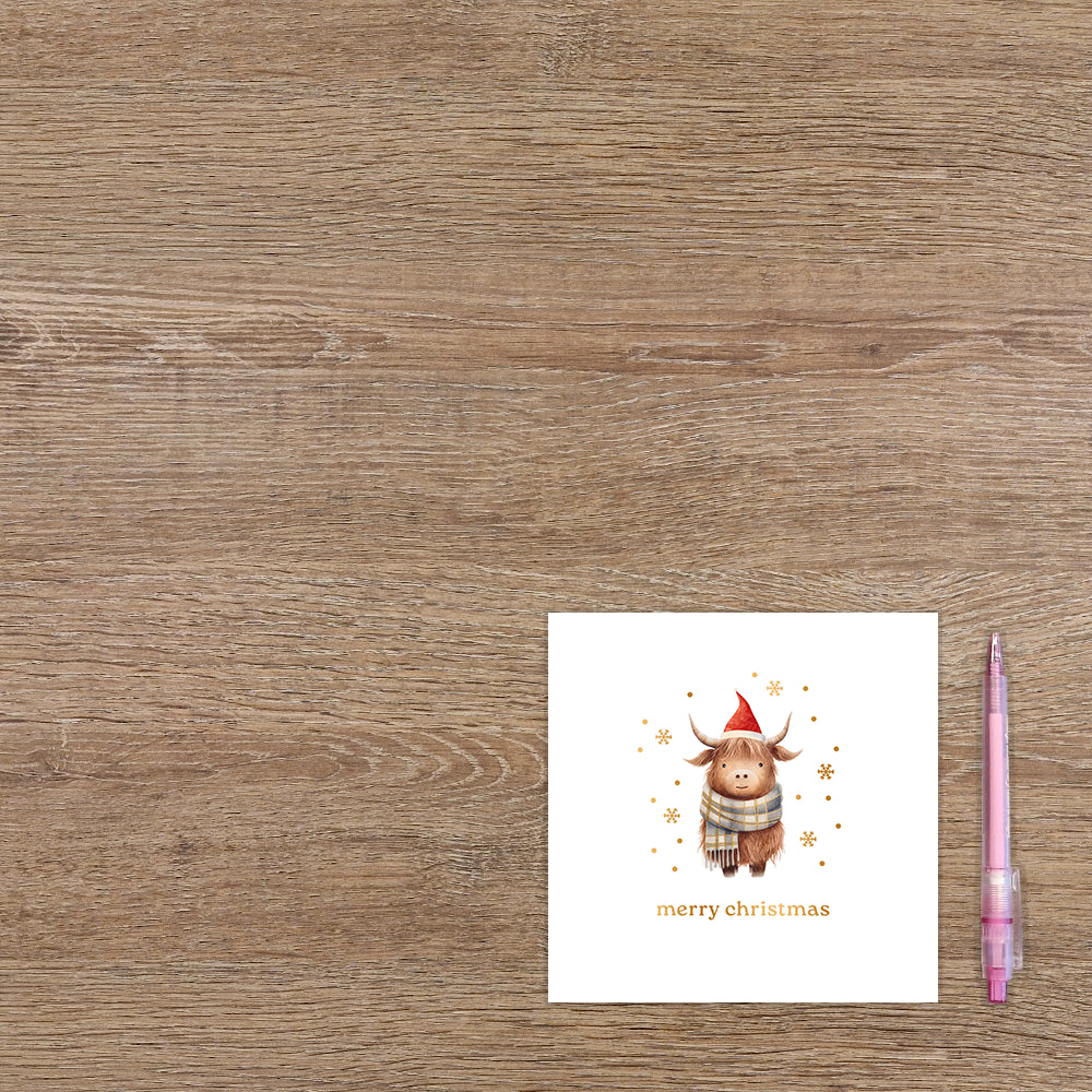 De wenskaart heeft een afmeting van x en een vierkante vorm. Op deze kerstkaart staat een Schotse Hooglander met een kerstmuts en sjaal. Onder de illustratie staat de tekst: "Merry christmast". De binnenzijde van de wenskaart is blanco wat voldoende ruimte geeft om een persoonlijke boodschap te schrijven .