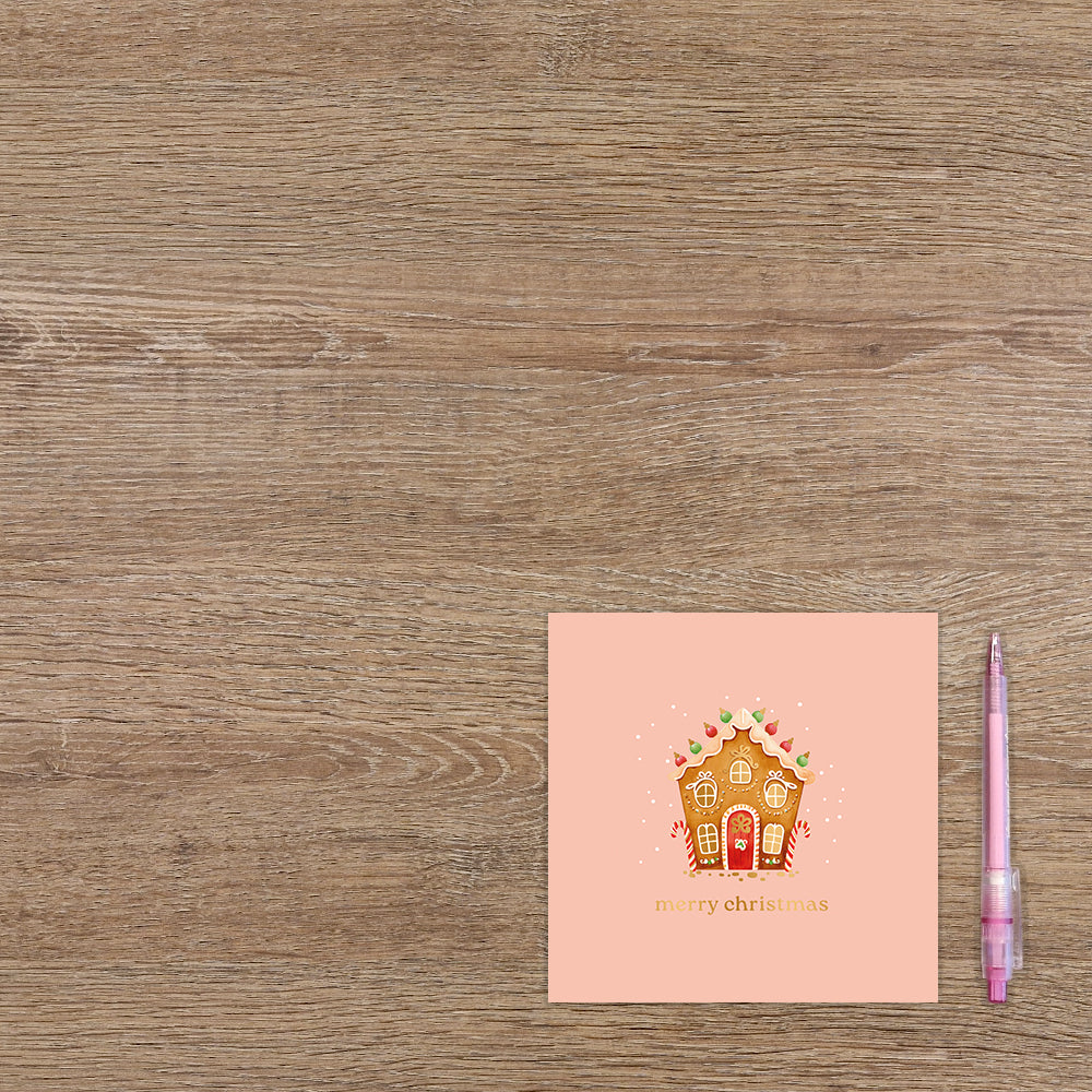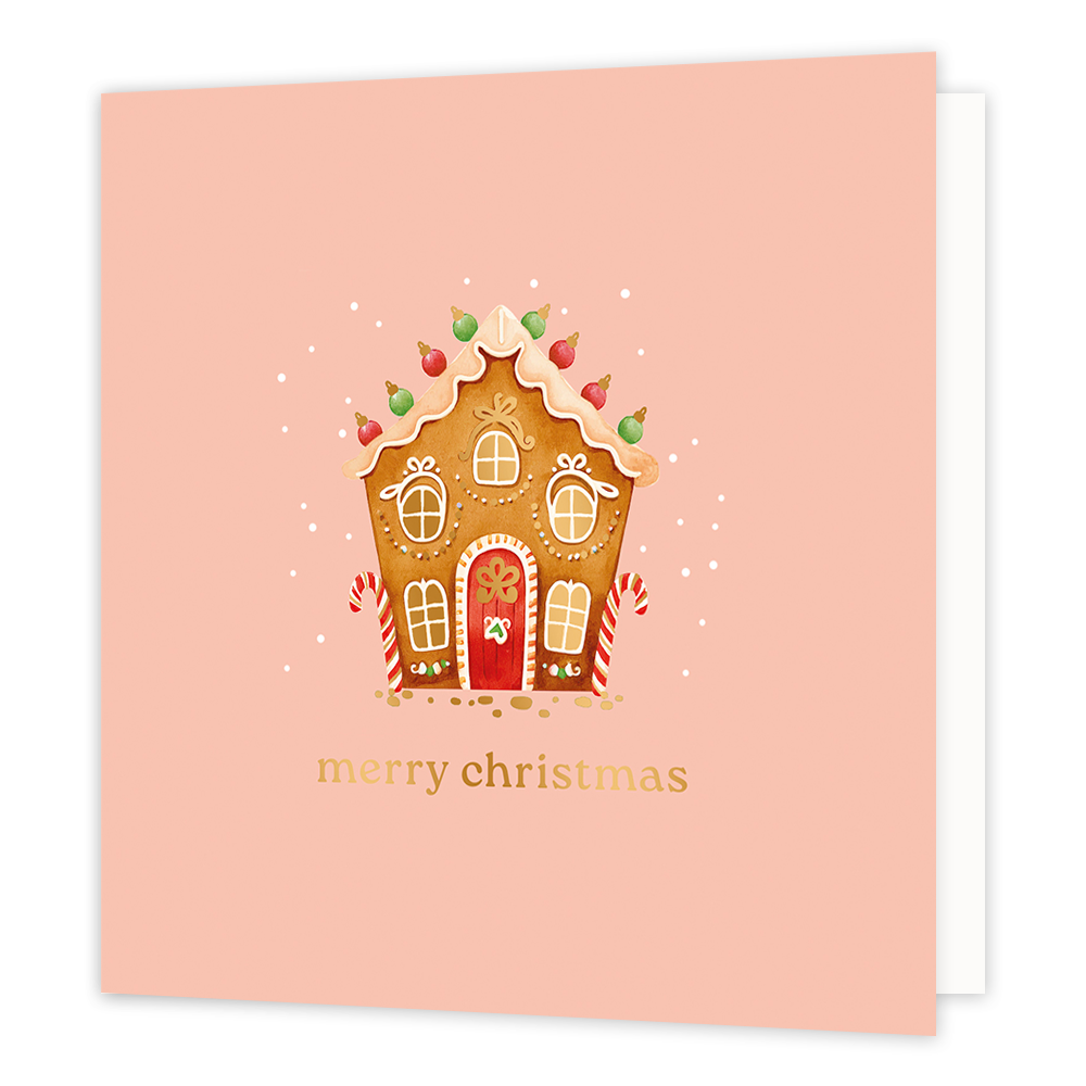 De wenskaart heeft een afmeting van x en een vierkante vorm. Op deze kerstkaart staat een gingerbread huis met daaronder de tekst: "Merry christmas". De binnenzijde van de wenskaart is blanco wat voldoende ruimte geeft om een persoonlijke boodschap te schrijven .