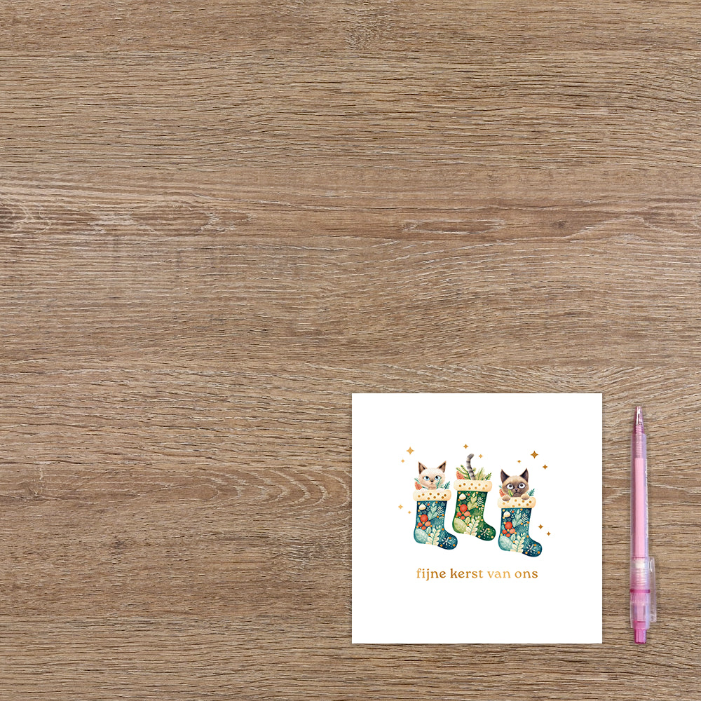 De wenskaart heeft een afmeting van x en een vierkante vorm. Op deze kerstkaart staan drie kerstsokken waar poesjes uit komen, met daaronder de tekst: "Fijne kerst van ons". De binnenzijde van de wenskaart is blanco wat voldoende ruimte geeft om een persoonlijke boodschap te schrijven .