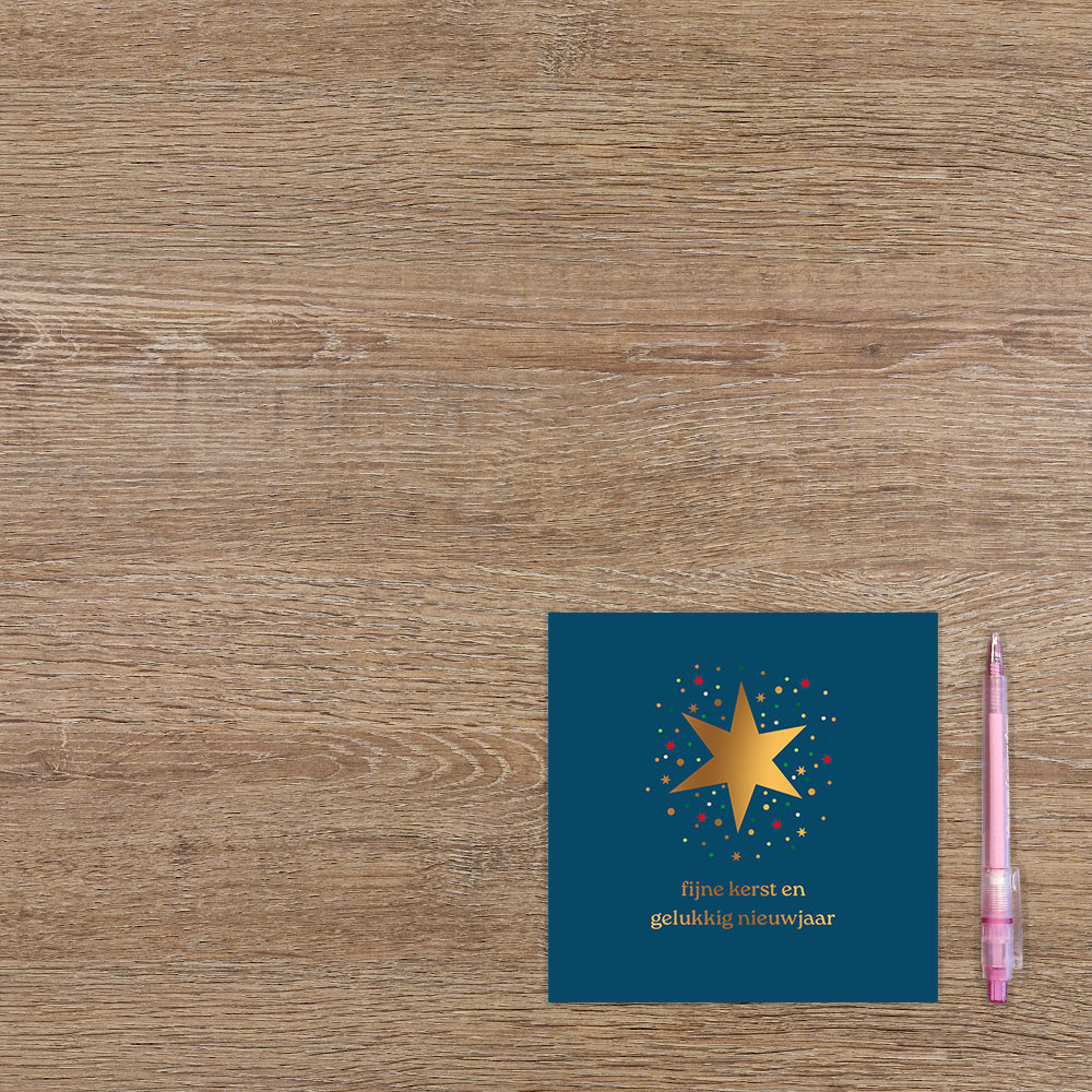De wenskaart heeft een afmeting van x en een vierkante vorm. Op deze kerstkaart staat een gouden kerstster met daaronder de tekst: "Fijne kerst en gelukkig nieuwjaar". De binnenzijde van de wenskaart is blanco wat voldoende ruimte geeft om een persoonlijke boodschap te schrijven .