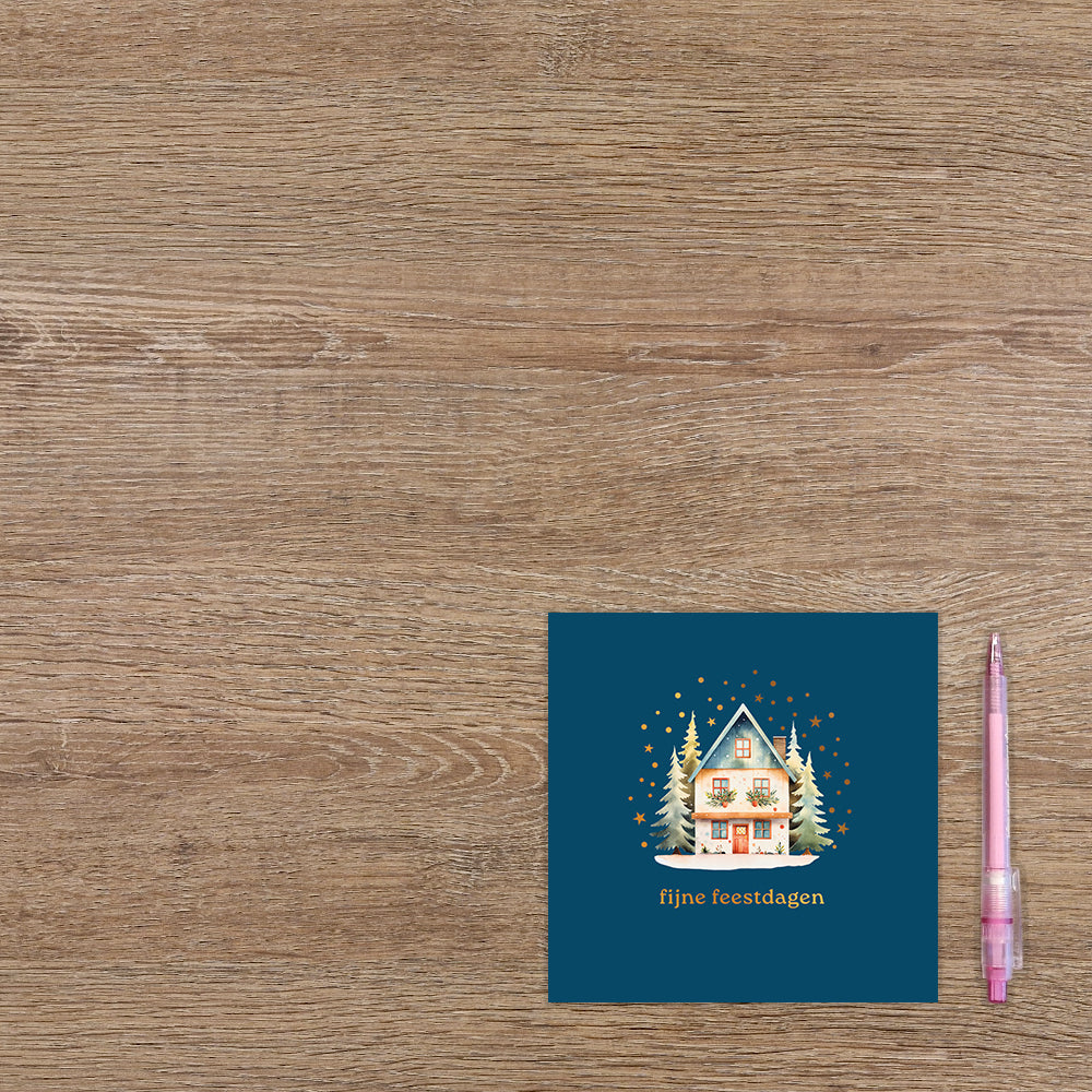 De wenskaart heeft een afmeting van x en een vierkante vorm. Op deze kerstkaart staat een huis met daaronder de tekst: "Fijne feestdagen". De binnenzijde van de wenskaart is blanco wat voldoende ruimte geeft om een persoonlijke boodschap te schrijven .