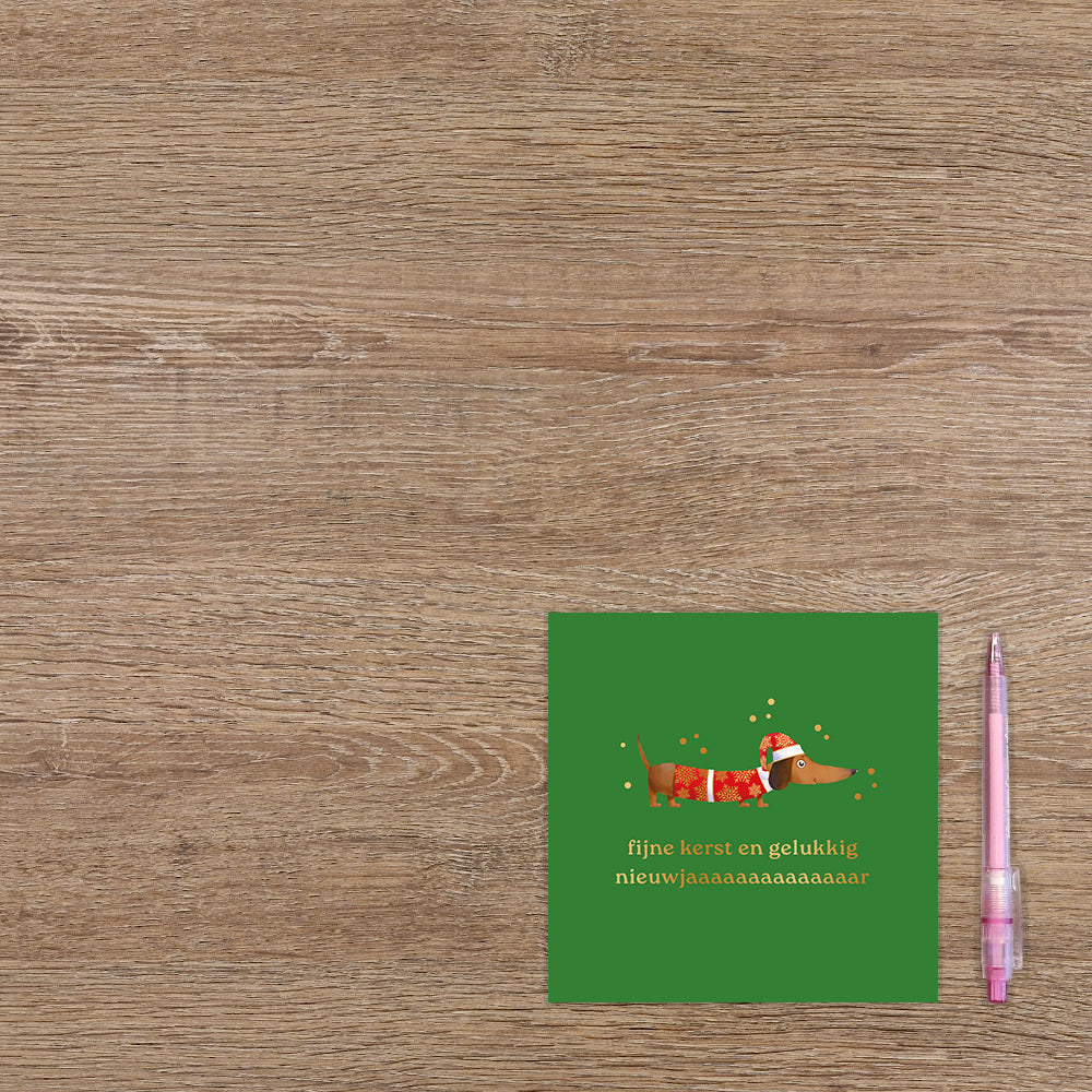 De wenskaart heeft een afmeting van x en een vierkante vorm. Op deze kerstkaart staat een teckel met daaronder de tekst: "Fijne kerst en gelukkig nieuwjaar". De binnenzijde van de wenskaart is blanco wat voldoende ruimte geeft om een persoonlijke boodschap te schrijven .