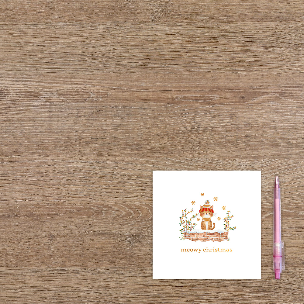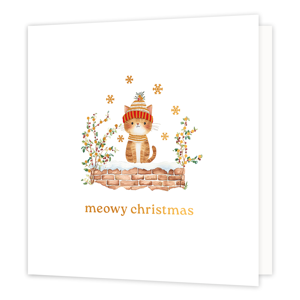 De wenskaart heeft een afmeting van x en een vierkante vorm. Op deze kerstkaart staat een kat met daaronder de tekst: "Meowy christmas". De binnenzijde van de wenskaart is blanco wat voldoende ruimte geeft om een persoonlijke boodschap te schrijven .