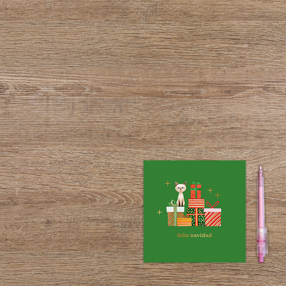 De wenskaart heeft een afmeting van x en een vierkante vorm. Op deze kerstkaart staat een kat die op cadeautjes zit met daaronder de tekst: "Feliz navidad". De binnenzijde van de wenskaart is blanco wat voldoende ruimte geeft om een persoonlijke boodschap te schrijven .