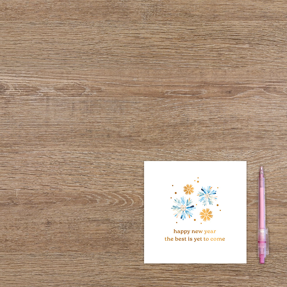 De wenskaart heeft een afmeting van x en een vierkante vorm. Op deze kerstkaart staan ronde bloemetjes met daaronder de tekst: "Happy new year the best is yet to come". De binnenzijde van de wenskaart is blanco wat voldoende ruimte geeft om een persoonlijke boodschap te schrijven .