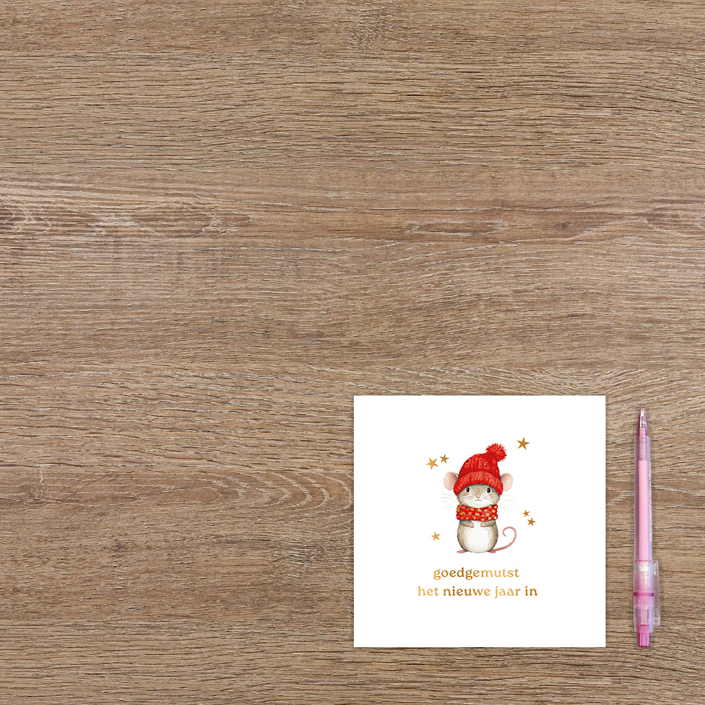De wenskaart heeft een afmeting van x en een vierkante vorm. Op deze kerstkaart staat een muisje met muts en sjaal en daaronder de tekst: "Goedgemutst het nieuwe jaar in". De binnenzijde van de wenskaart is blanco wat voldoende ruimte geeft om een persoonlijke boodschap te schrijven .