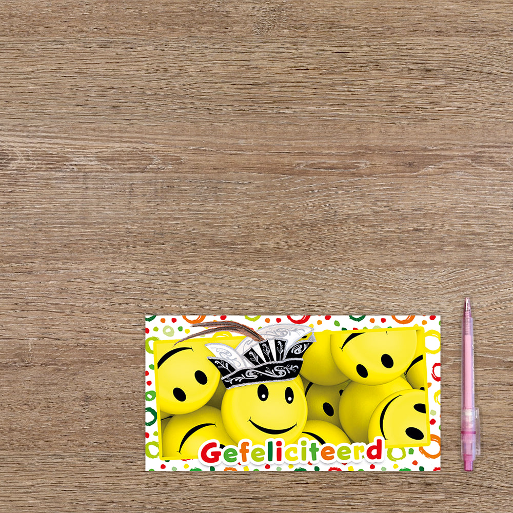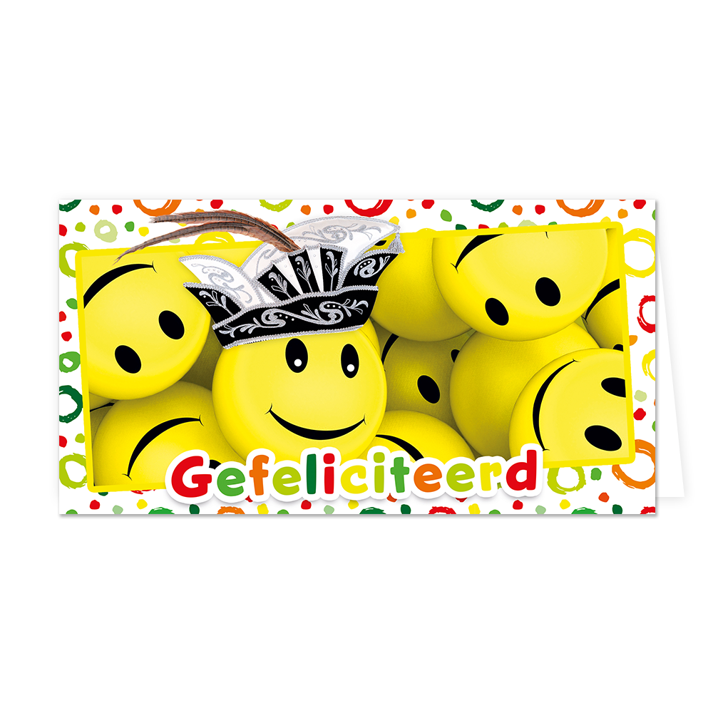 De wenskaart heeft een afmeting van x en een staande vorm. Op deze carnavalskaart staan smileys met de tekst: "Gefeliciteerd". De binnenzijde van de wenskaart is blanco wat voldoende ruimte geeft om een persoonlijke boodschap te schrijven .