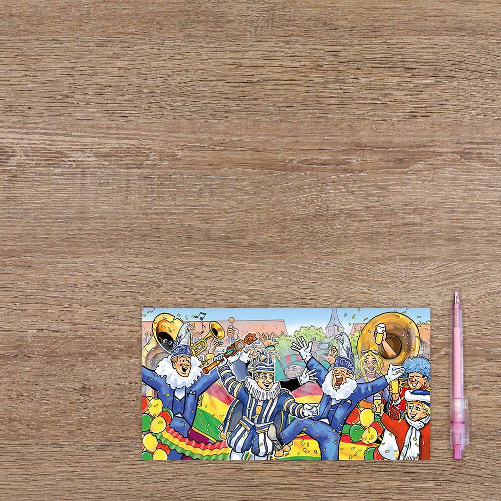 De wenskaart heeft een afmeting van x en een staande vorm. Op deze carnavalskaart is een carnavalsoptocht te zien. De binnenzijde van de wenskaart is blanco wat voldoende ruimte geeft om een persoonlijke boodschap te schrijven .