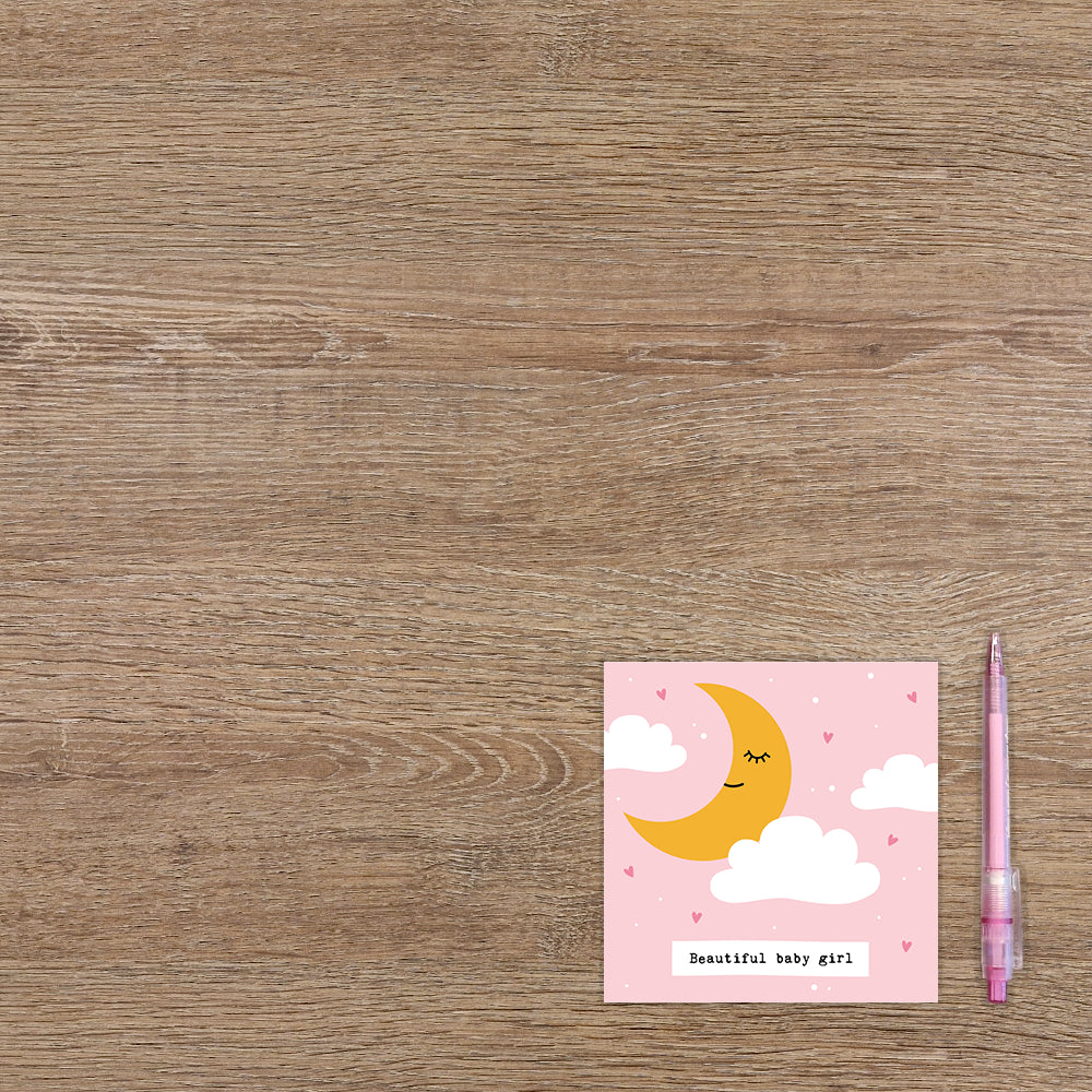 De wenskaart heeft een afmeting van x en een vierkante vorm. Op deze wenskaart staat een halve maan omringt door wolken op een roze achtergrond. Onderaan staat de tekst: "Beautiful baby girl". De binnenzijde van de wenskaart is blanco wat voldoende ruimte geeft om een persoonlijke boodschap te schrijven .