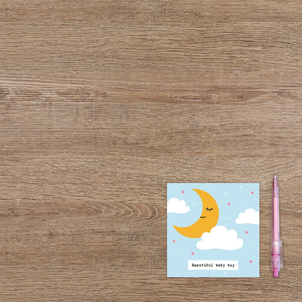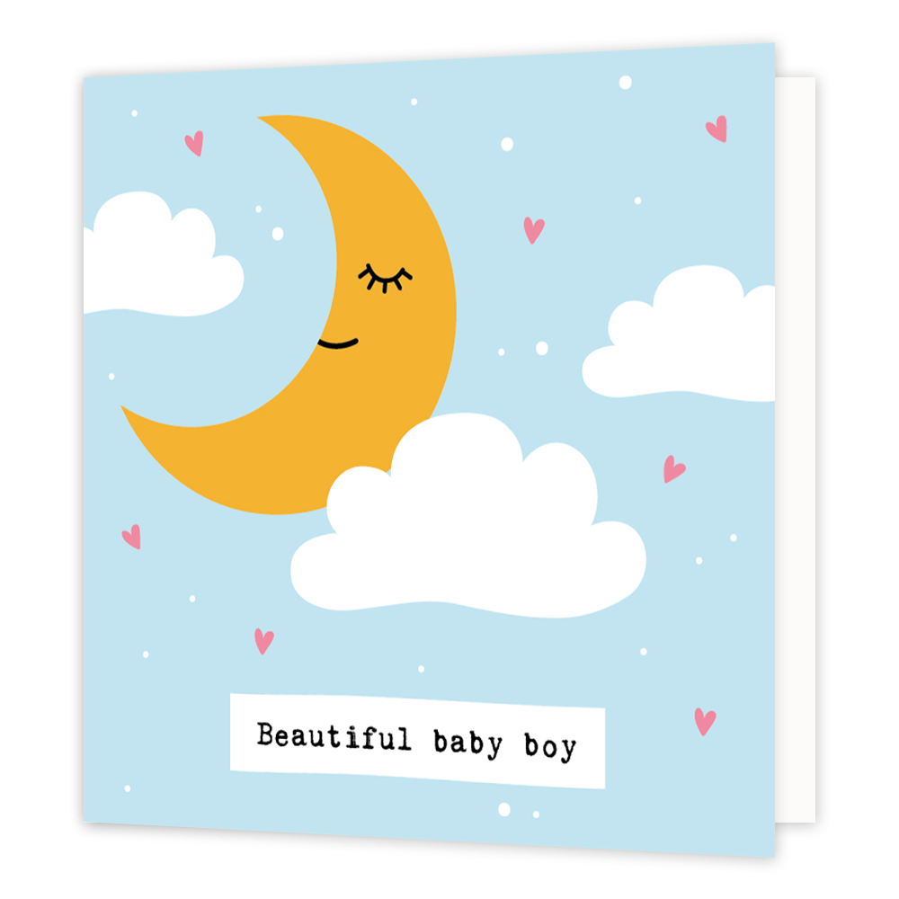 De wenskaart heeft een afmeting van x en een vierkante vorm. Op deze wenskaart staat een halve maan omringt door wolken op een blauwe achtergrond. Onderaan staat de tekst: "Beautiful baby boy". De binnenzijde van de wenskaart is blanco wat voldoende ruimte geeft om een persoonlijke boodschap te schrijven .