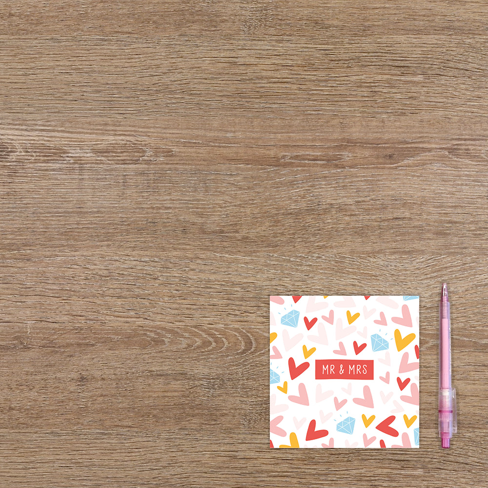 De wenskaart heeft een afmeting van x en een vierkante vorm. Op deze wenskaart staan hartjes in de kleuren rood, roze, beige en goud met diamanten en in het midden de tekst: "MR & MRS". De binnenzijde van de wenskaart is blanco wat voldoende ruimte geeft om een persoonlijke boodschap te schrijven .