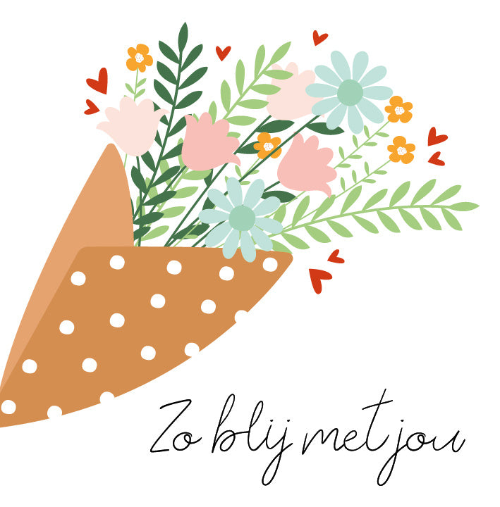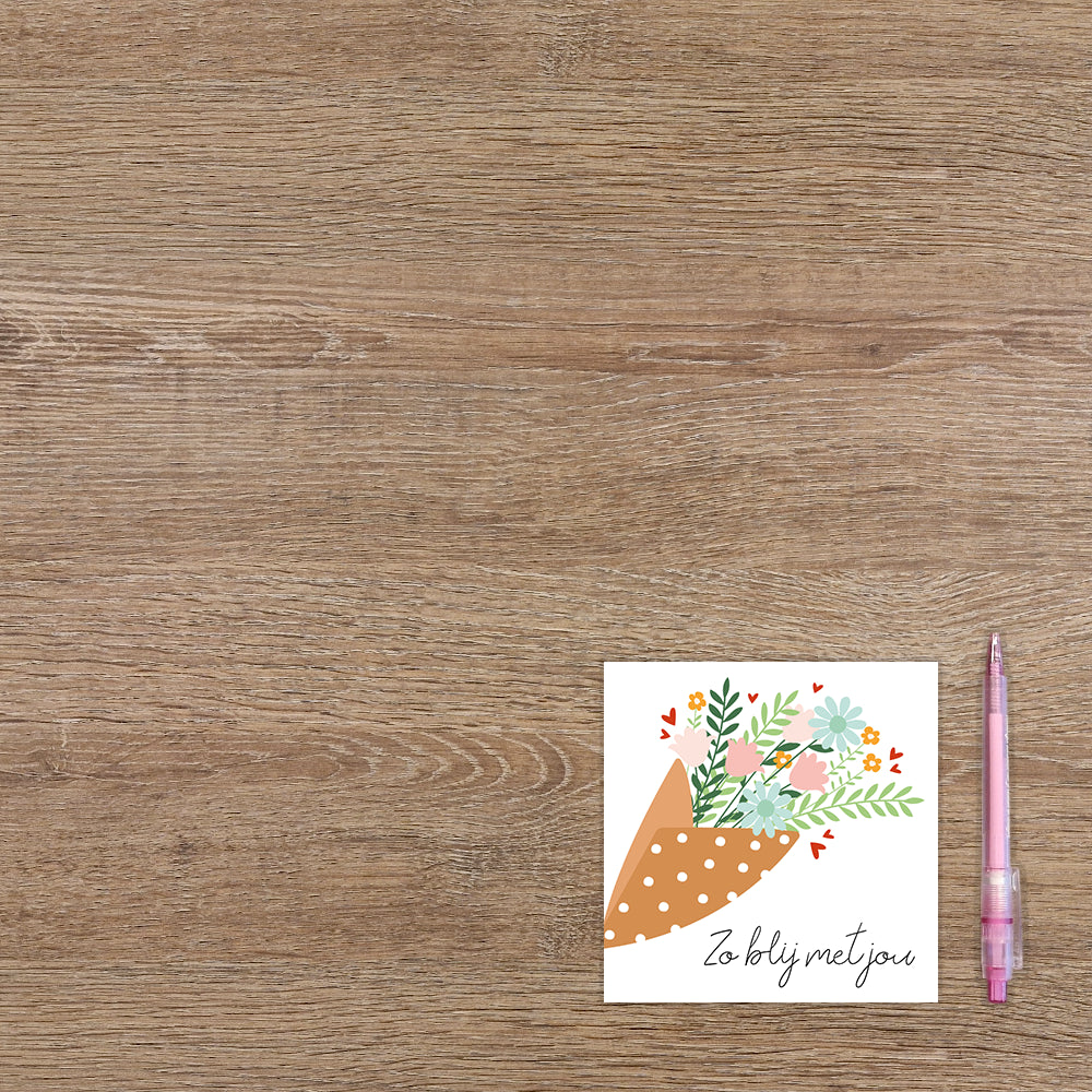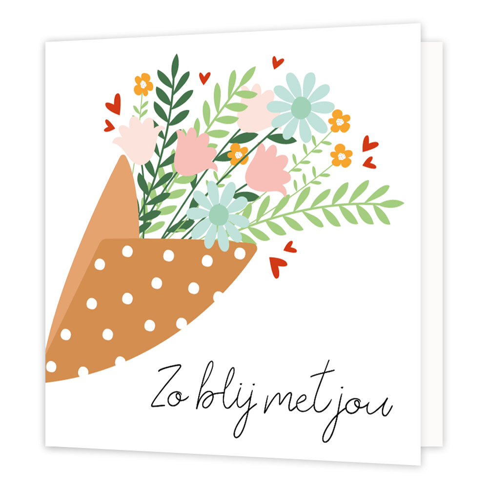 De wenskaart heeft een afmeting van x en een vierkante vorm. Op deze wenskaart staat een boeket metbloemen in de kleuren roze, beige, geel, groen en blauw met daaronder de tekst: "Zo blij met jou". De binnenzijde van de wenskaart is blanco wat voldoende ruimte geeft om een persoonlijke boodschap te schrijven .