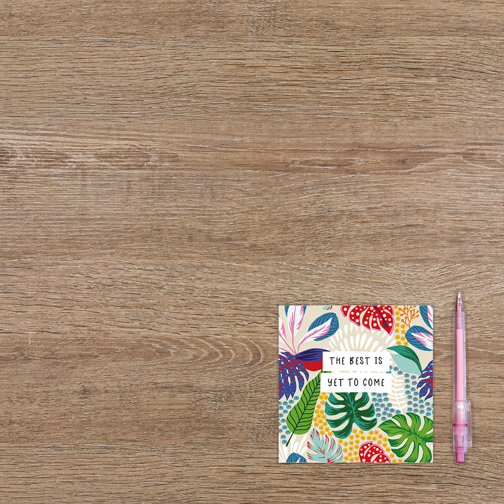 De wenskaart heeft een afmeting van x en een vierkante vorm. Op deze wenskaart staan bladeren in de kleuren groen, geel, blauw, wit, paars, rood en roze, met in het midden de tekst: "The best is yet to come". De binnenzijde van de wenskaart is blanco wat voldoende ruimte geeft om een persoonlijke boodschap te schrijven .