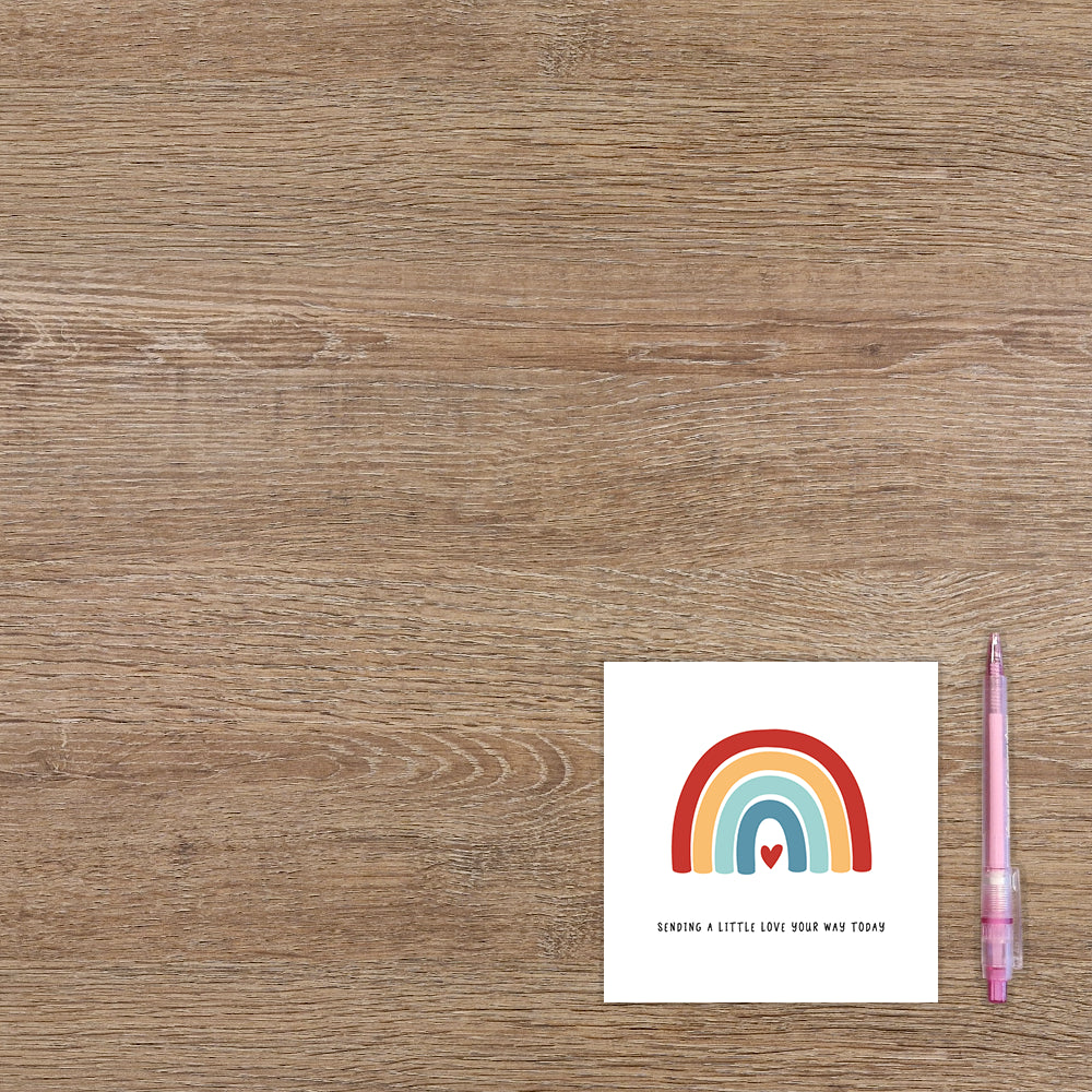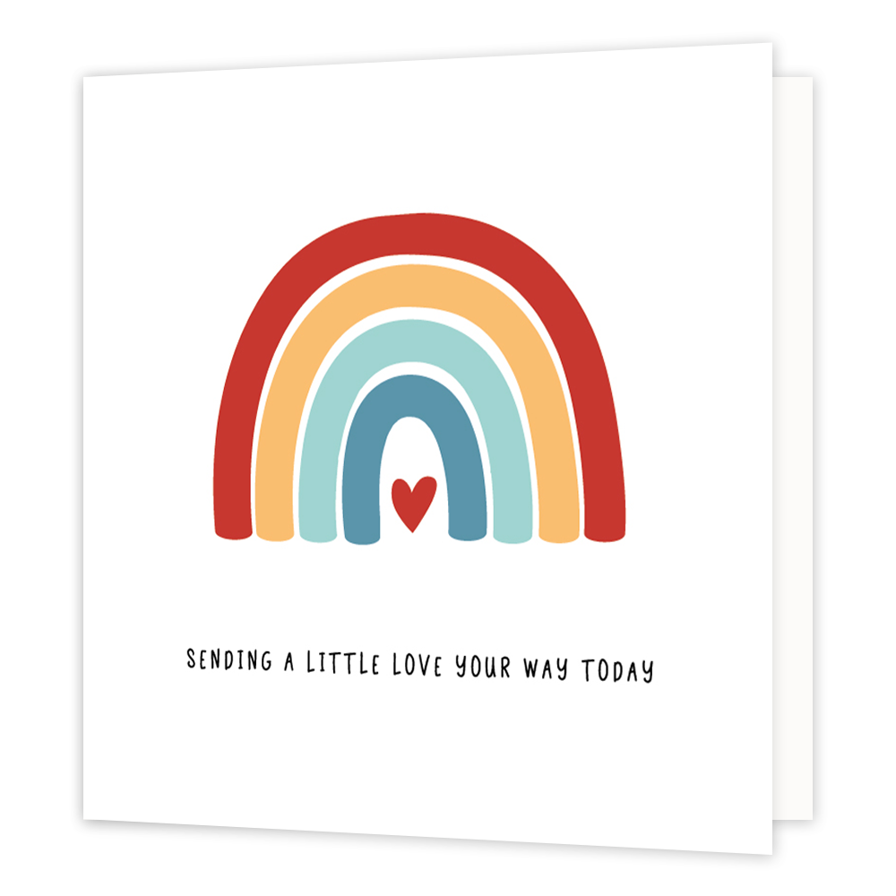 De wenskaart heeft een afmeting van x en een vierkante vorm. Op deze wenskaart staat een regenboog met daaronder de tekst: "Sending a little love your way today". De binnenzijde van de wenskaart is blanco wat voldoende ruimte geeft om een persoonlijke boodschap te schrijven .