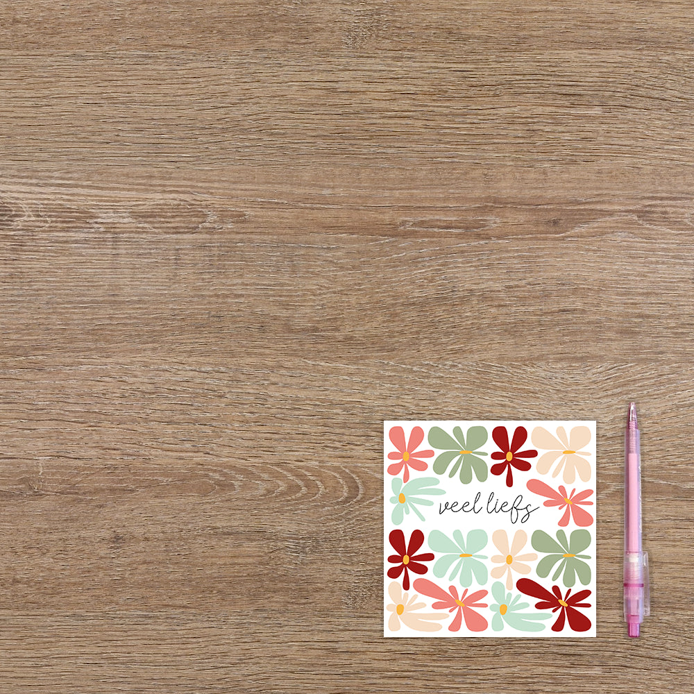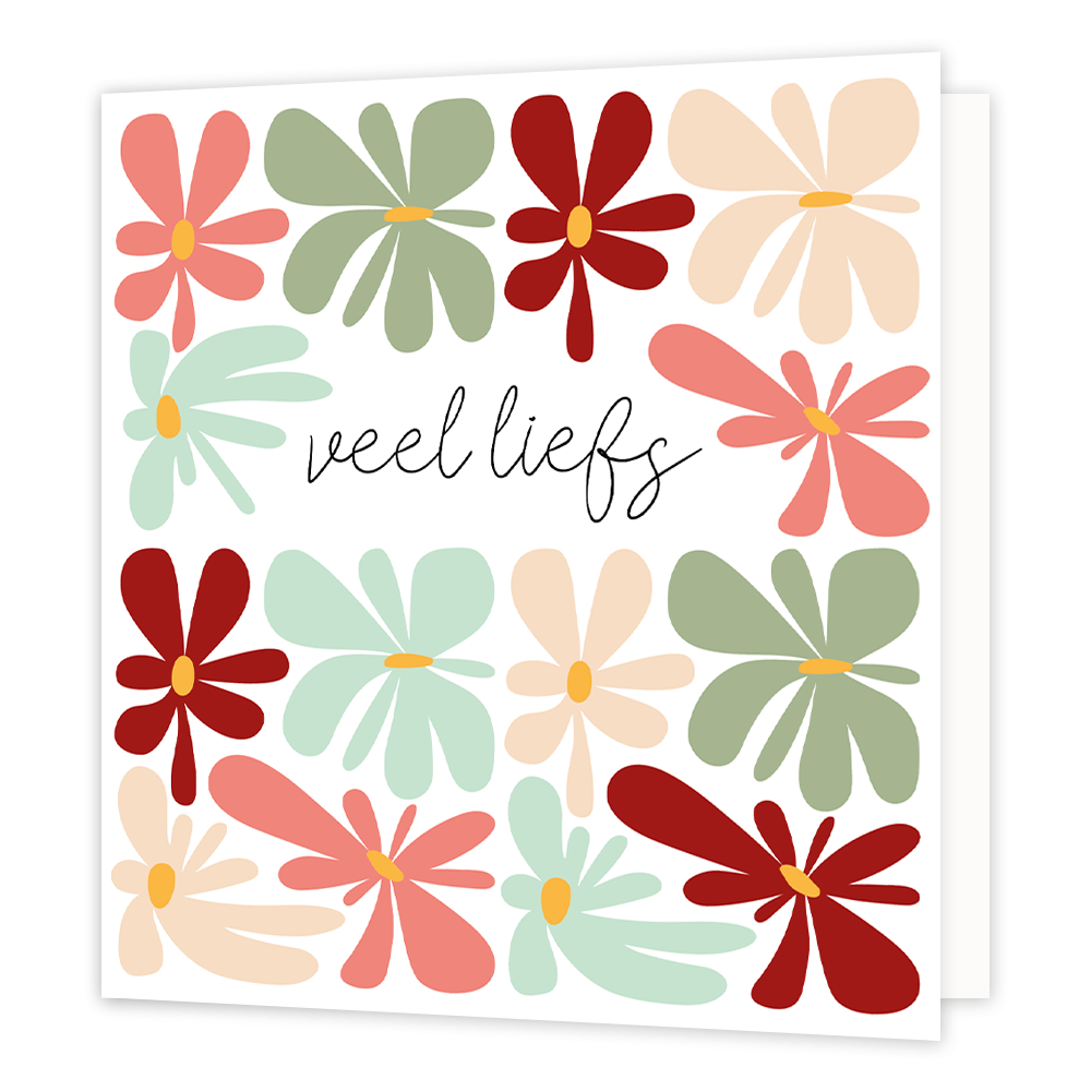 De wenskaart heeft een afmeting van x en een vierkante vorm. Op deze wenskaart staan bloemen in de kleuren groen, beige, rood, roze en mintblauw, met in het midden de tekst: "Veel liefs". De binnenzijde van de wenskaart is blanco wat voldoende ruimte geeft om een persoonlijke boodschap te schrijven .