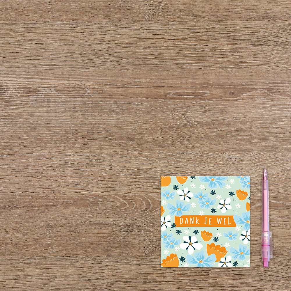 De wenskaart heeft een afmeting van x en een vierkante vorm. Op deze wenskaart staan bloemen in de kleuren blauw, oranje en wit, met in het midden de tekst: "Dank je wel". De binnenzijde van de wenskaart is blanco wat voldoende ruimte geeft om een persoonlijke boodschap te schrijven .