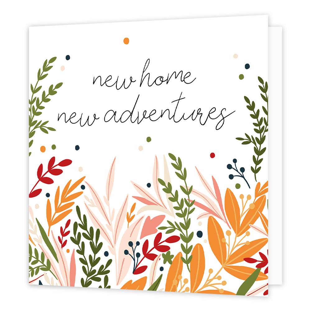 De wenskaart heeft een afmeting van x en een vierkante vorm. Op deze wenskaart staan bladeren in de kleuren groen, roze, beige, rood en oranje, met daarboven de tekst: "New home new adventures". De binnenzijde van de wenskaart is blanco wat voldoende ruimte geeft om een persoonlijke boodschap te schrijven .