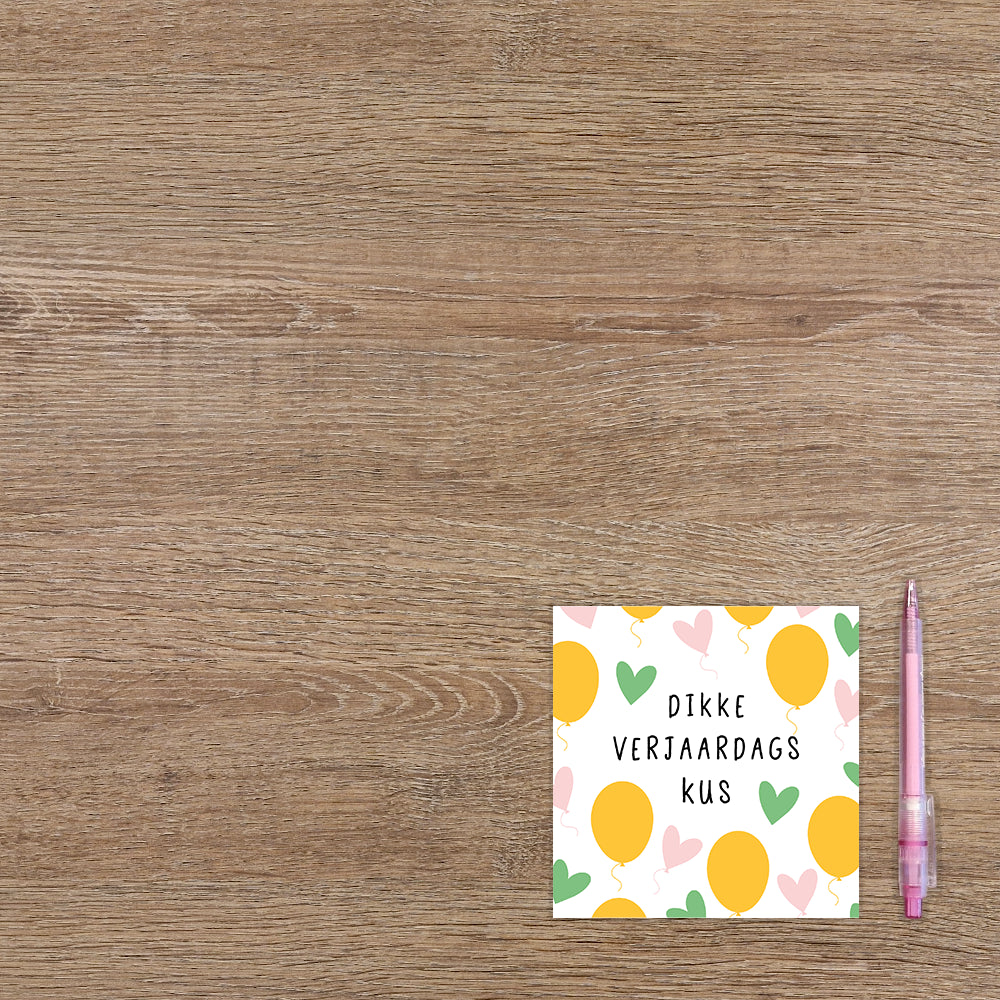 De wenskaart heeft een afmeting van x en een vierkante vorm. Op deze wenskaart staan ballonnen in de kleuren geel, roze en groen, met in het midden de tekst: "Dikke verjaardags kus". De binnenzijde van de wenskaart is blanco wat voldoende ruimte geeft om een persoonlijke boodschap te schrijven .