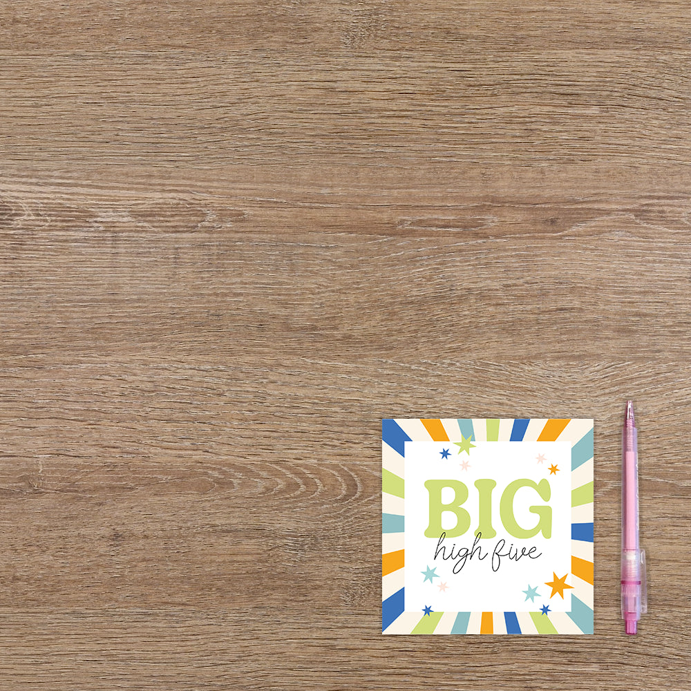 De wenskaart heeft een afmeting van x en een vierkante vorm. Op deze wenskaart staan lijnen in de kleuren oranje, biege, mintgroen, groen en blauw. In het midden zit een wit blok met de tekst: "Big high five". De binnenzijde van de wenskaart is blanco wat voldoende ruimte geeft om een persoonlijke boodschap te schrijven .