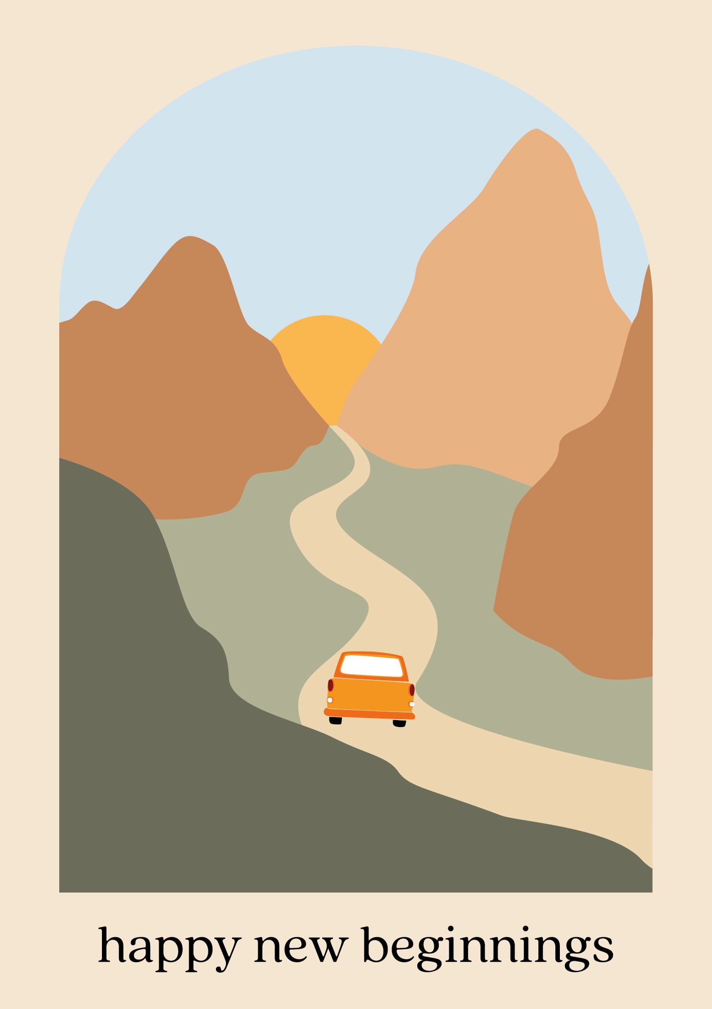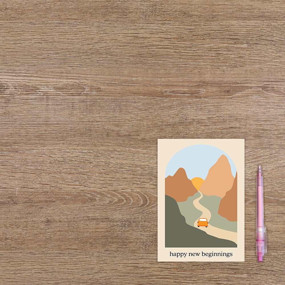 De wenskaart heeft een afmeting van x en een staande vorm. Op deze wenskaart staat een auto die door de bergen heen rijd naar de zon. Onder de illustratie staat de tekst: "Happy new beginnings". De binnenzijde van de wenskaart is bedrukt met een ontwerp passend bij de voorzijde van de kaart .