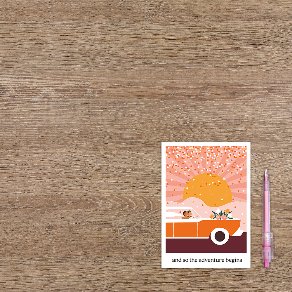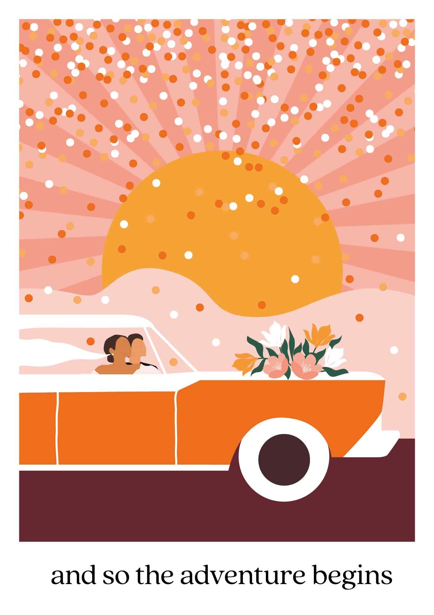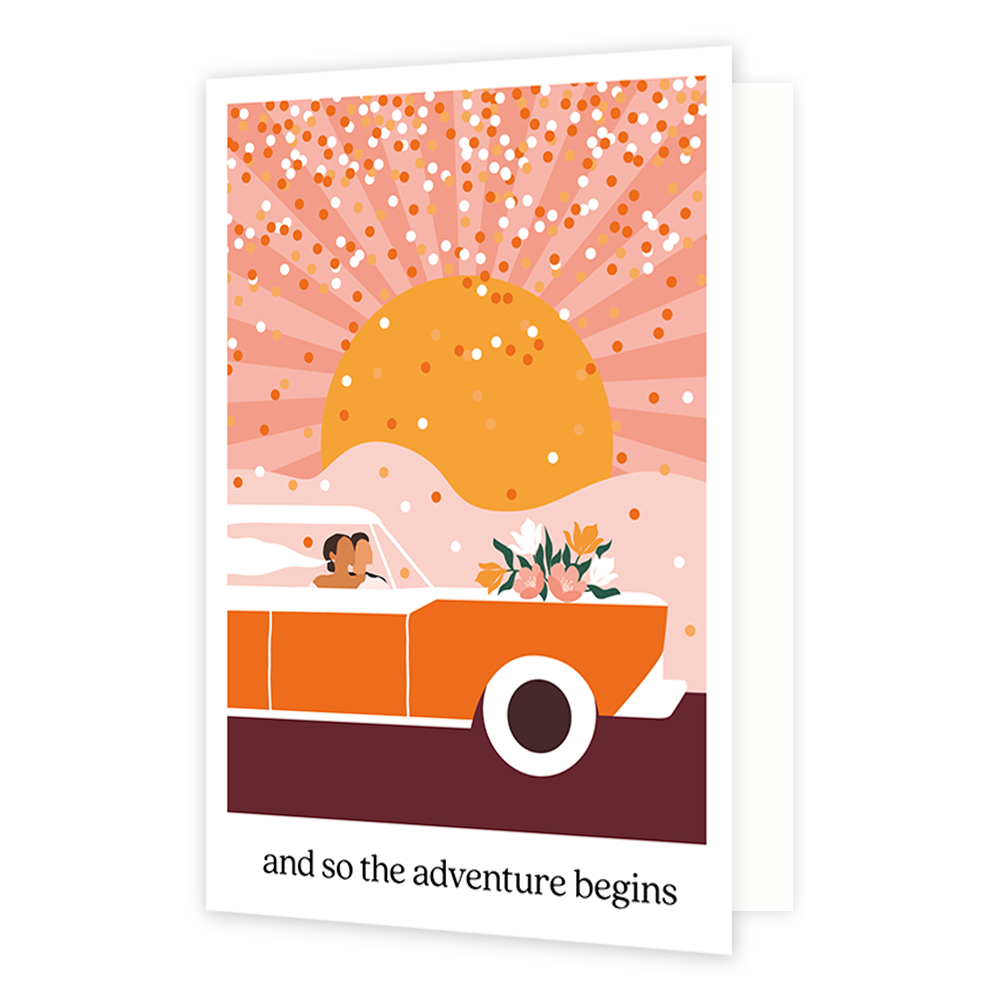 De wenskaart heeft een afmeting van x en een staande vorm. Op deze wenskaart staat een auto met een bruidspaar erin met een zon op de achtergrond. Onder de illustratie staat de tekst: "And so the adventure begins". De binnenzijde van de wenskaart is bedrukt met een ontwerp passend bij de voorzijde van de kaart .